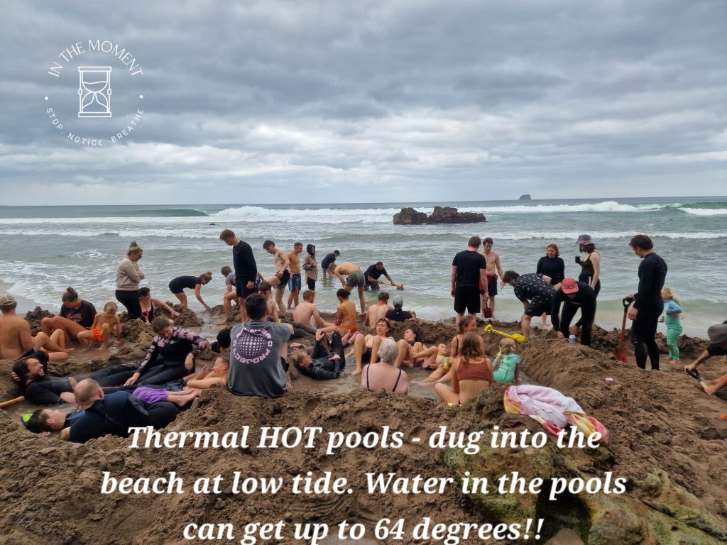 We drove down the east coast of the peninsula, it’s very different from the west coast. Our day was spent waiting. Waiting for low tide. Waiting to find hot sand with our toes. Waiting to dig. There is a stretch of sand about 50-60m long on this stunningly beautiful beach where there are pockets of hot water which escape to the surface. Everyone digs a hole in the sand to create a hot water pool. If you haven’t got your own spade, you can hire one for $10. The water, with a temperature as hot as 64 °C filters up from two underground fissures!! Of course, in my head, there is a lava pool beneath my toes! It is really easy to get burnt by the water. One pool was actually steaming! As you can see, it’s a very popular place…