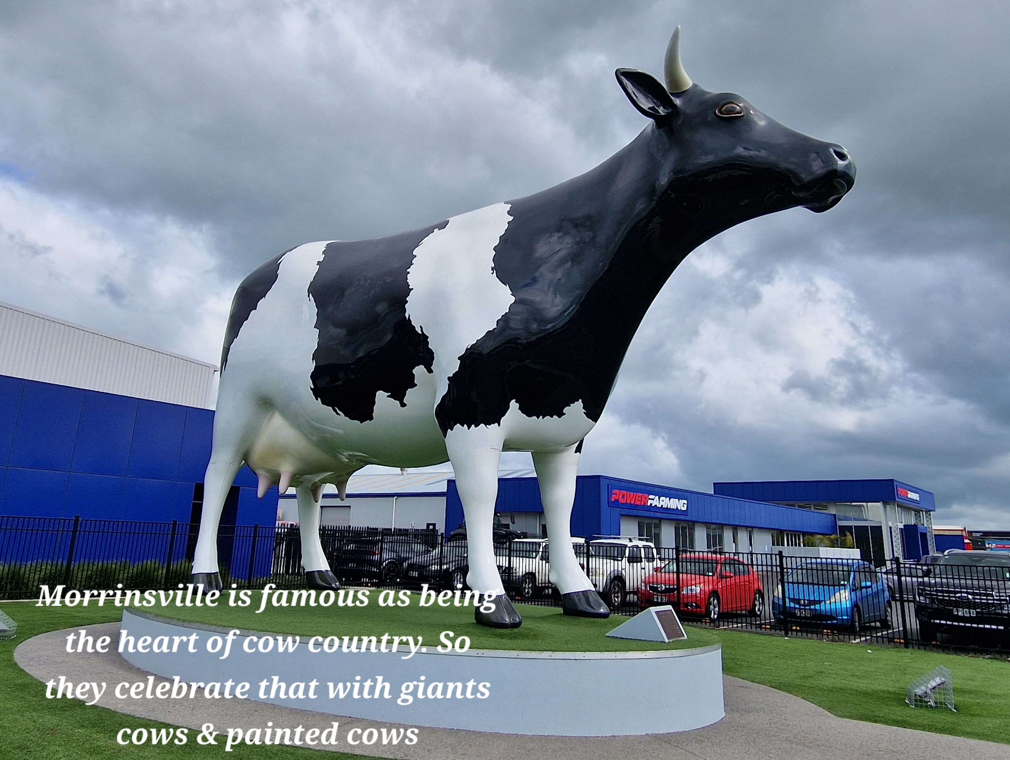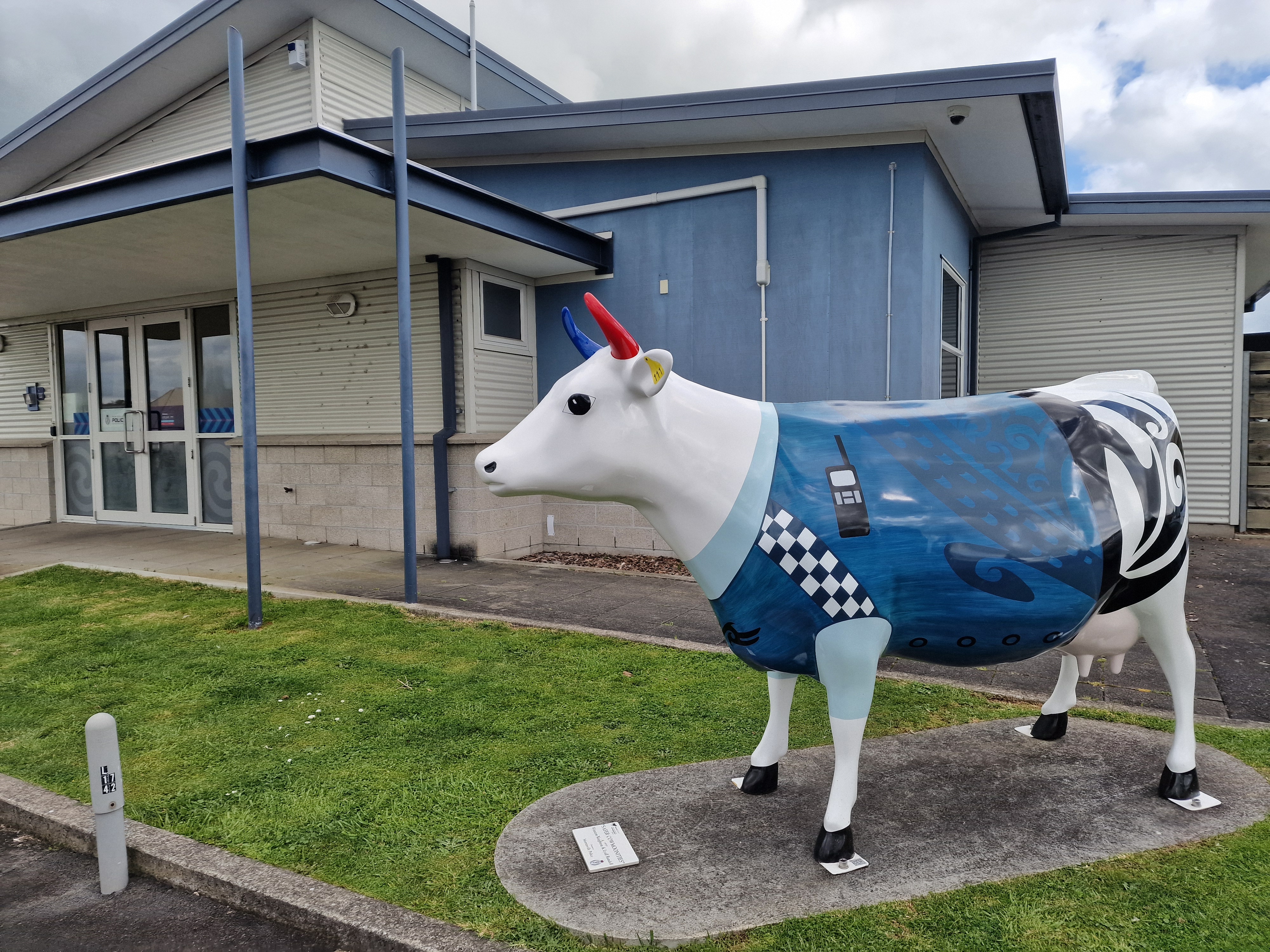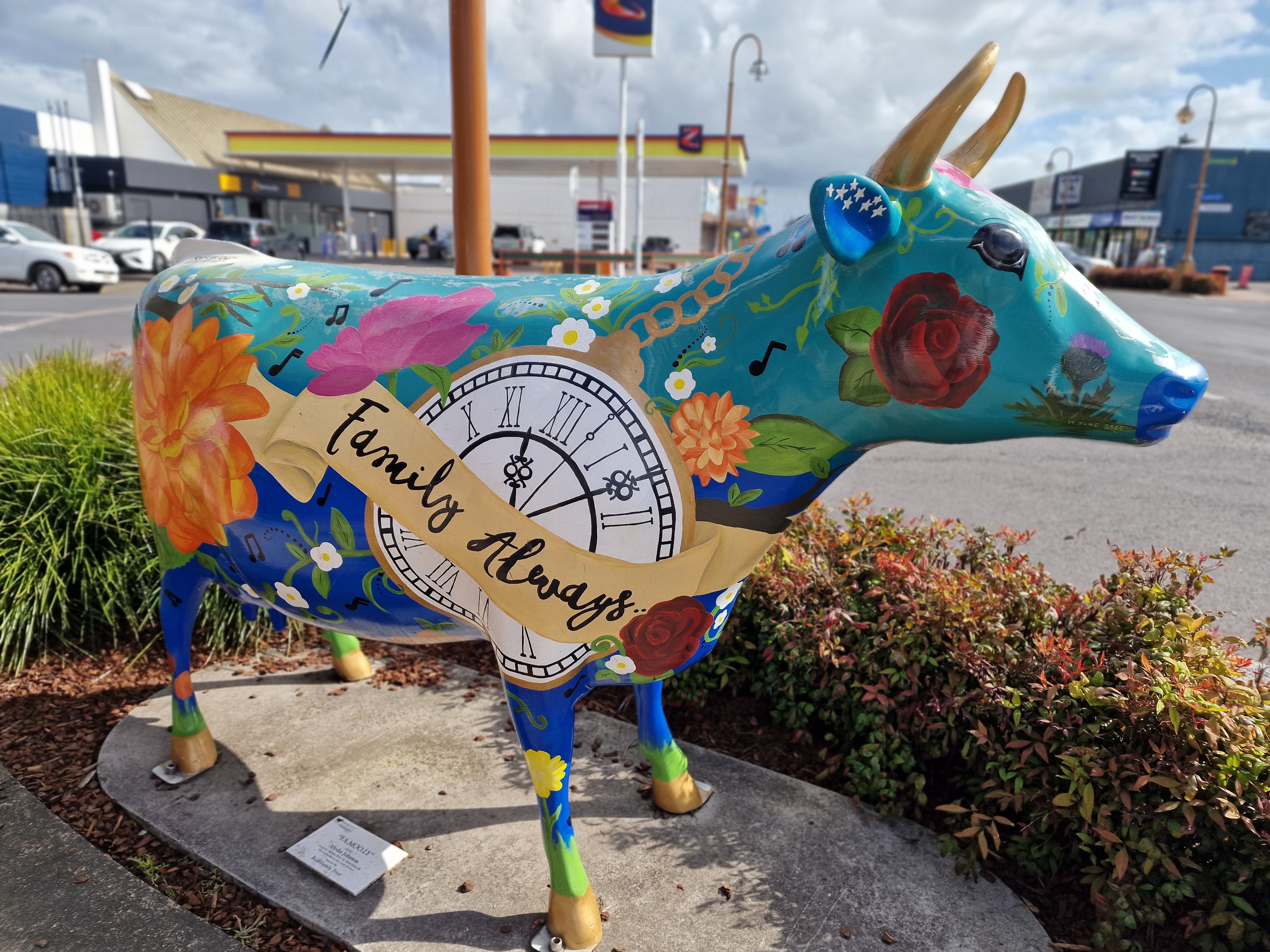 Our next stop was in Morrinsville. Famous for it’s dairy industry – COWS! On driving in to the town, your are greeted by Mable, a 6.5m high Friesian cow. After parking the van, we wander up and down the main street, spotting some of the 60 life size cows which have been painted by local artists. I think my favourite was the one outside the police station – this is Don’s favourite too!