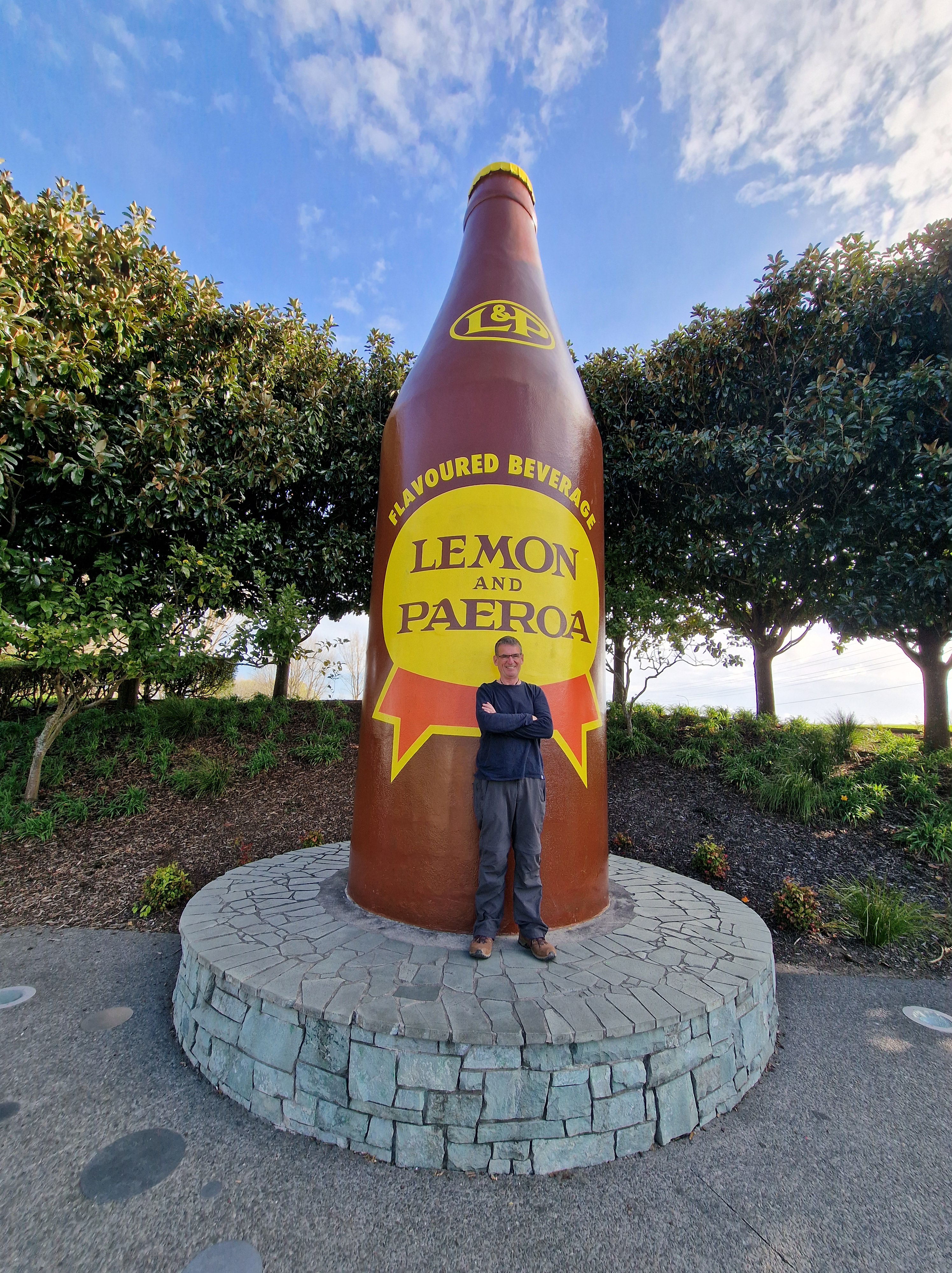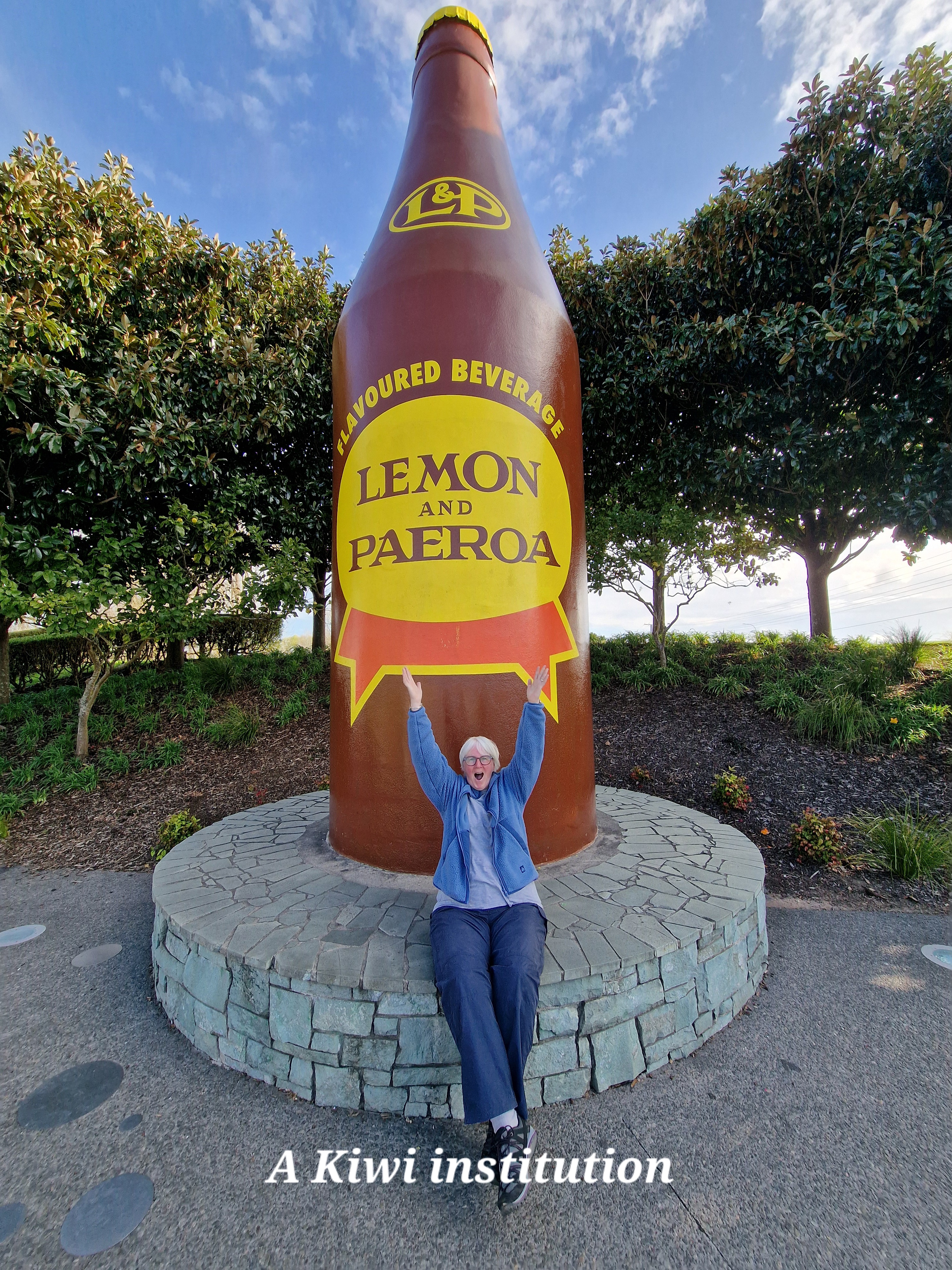 Our camp for the night is in Paeroa. This town is famous for one of New Zealand’s most famous products – L&P (Lemon & Paeroa). A lemony fizzy drink. To show due respect to the drink that carries the town’s name, they have erected a huge L&P bottle – well, why wouldn’t you!!