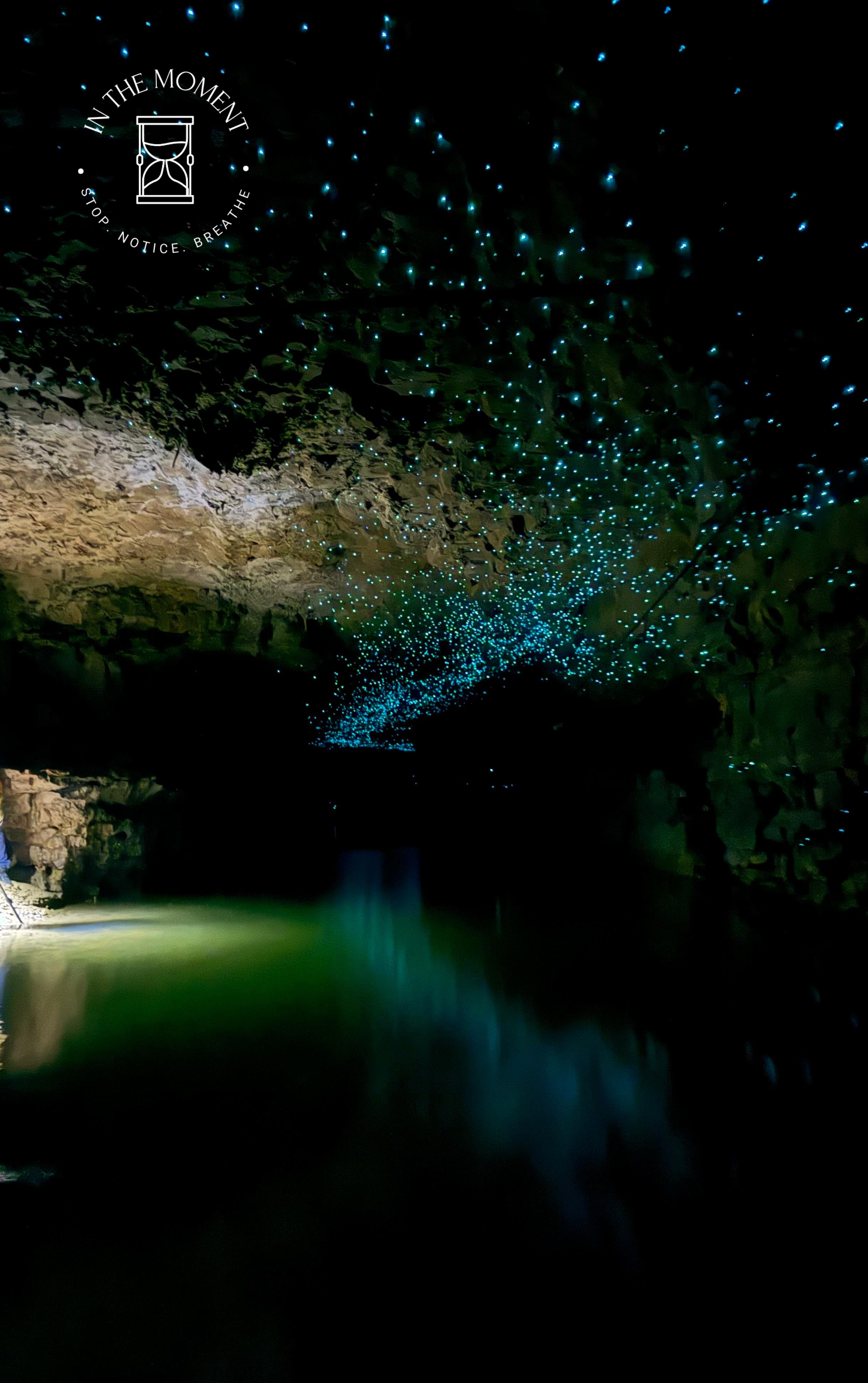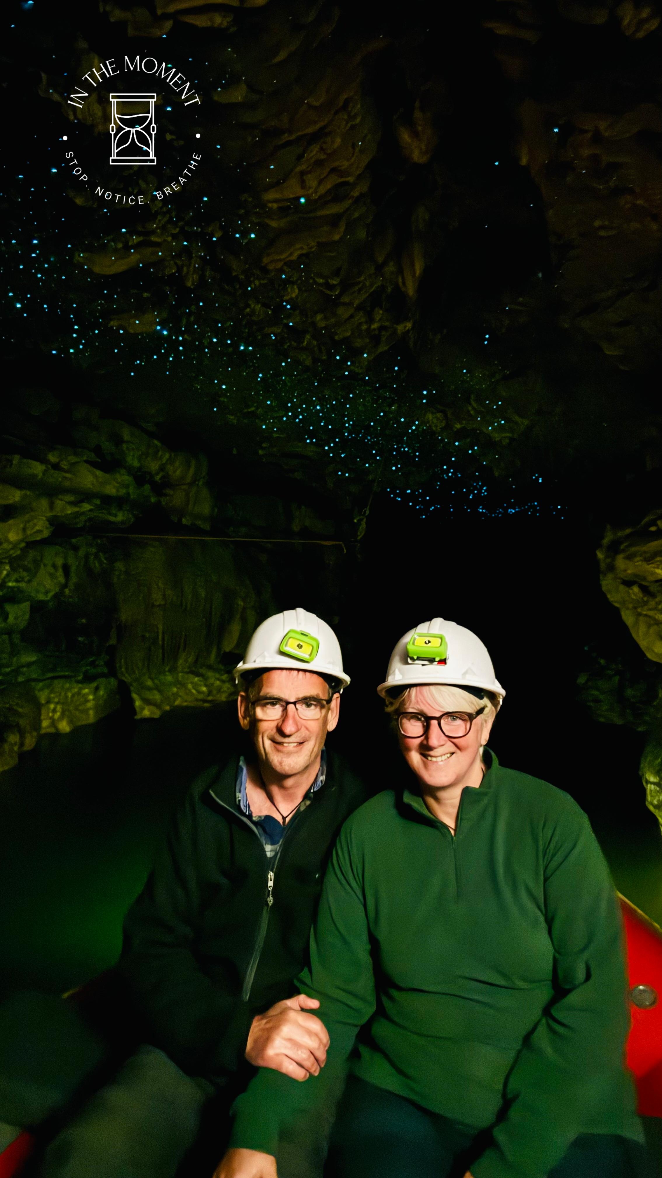 Below: We head to Waitomo. The caves here are home to glowworms and half a million visitors a year. As we are here for a birthday treat, we opt of a small family run company called Spellbound – and we were!! Twelve of us guided by Ross walk down to the cave entrance, put on our hard hats before descending into the first part of the cave where he explains all about these amazing little bugs. After a further walk down, we board our inflatable boat for our trip along the underground river where glowworms light the way. No words can describe it effectively but try and imagine looking at the galaxy on a crystal clear night. Or Van Gogh’s Starry Night. It was AWESOME!!