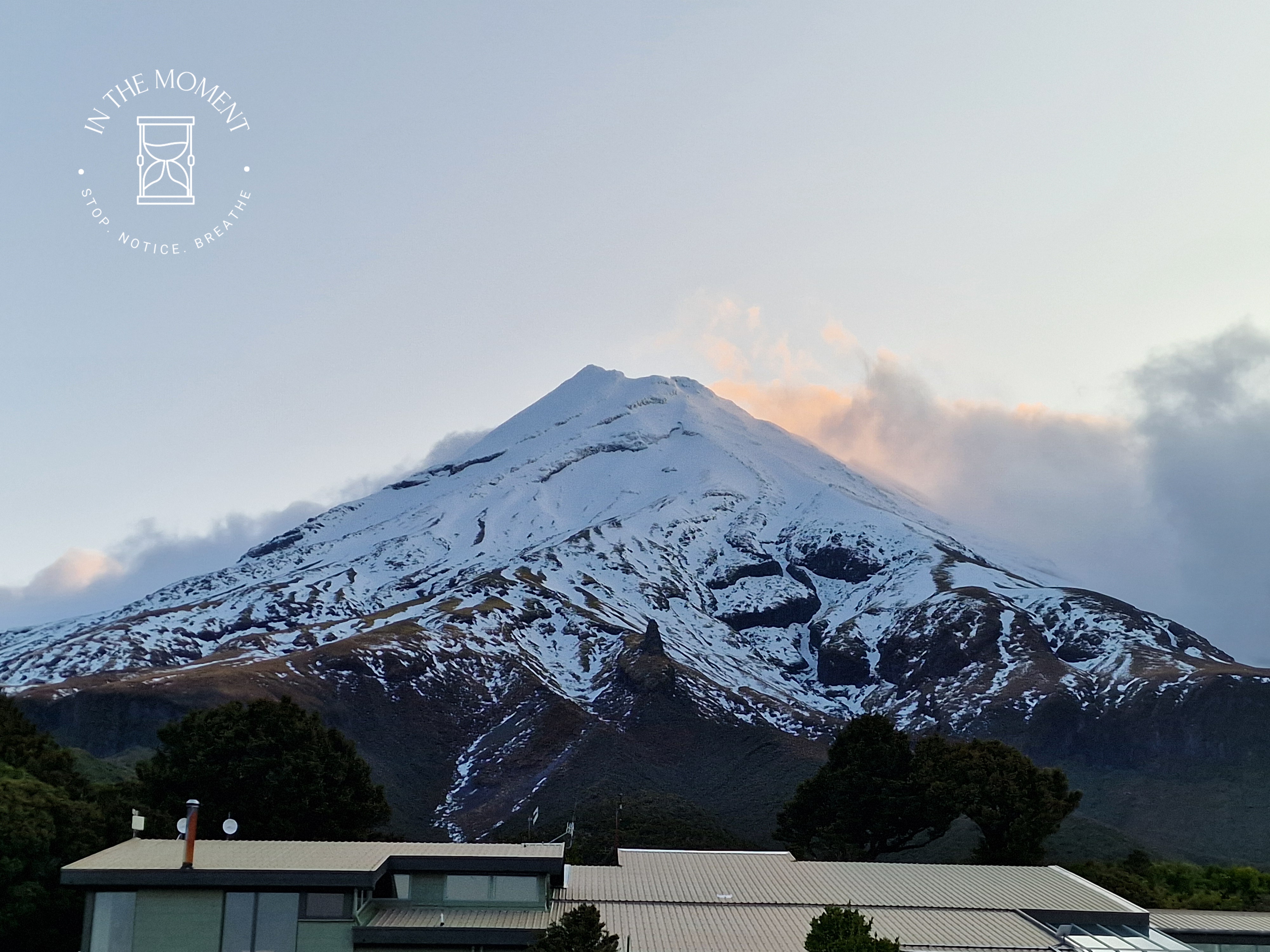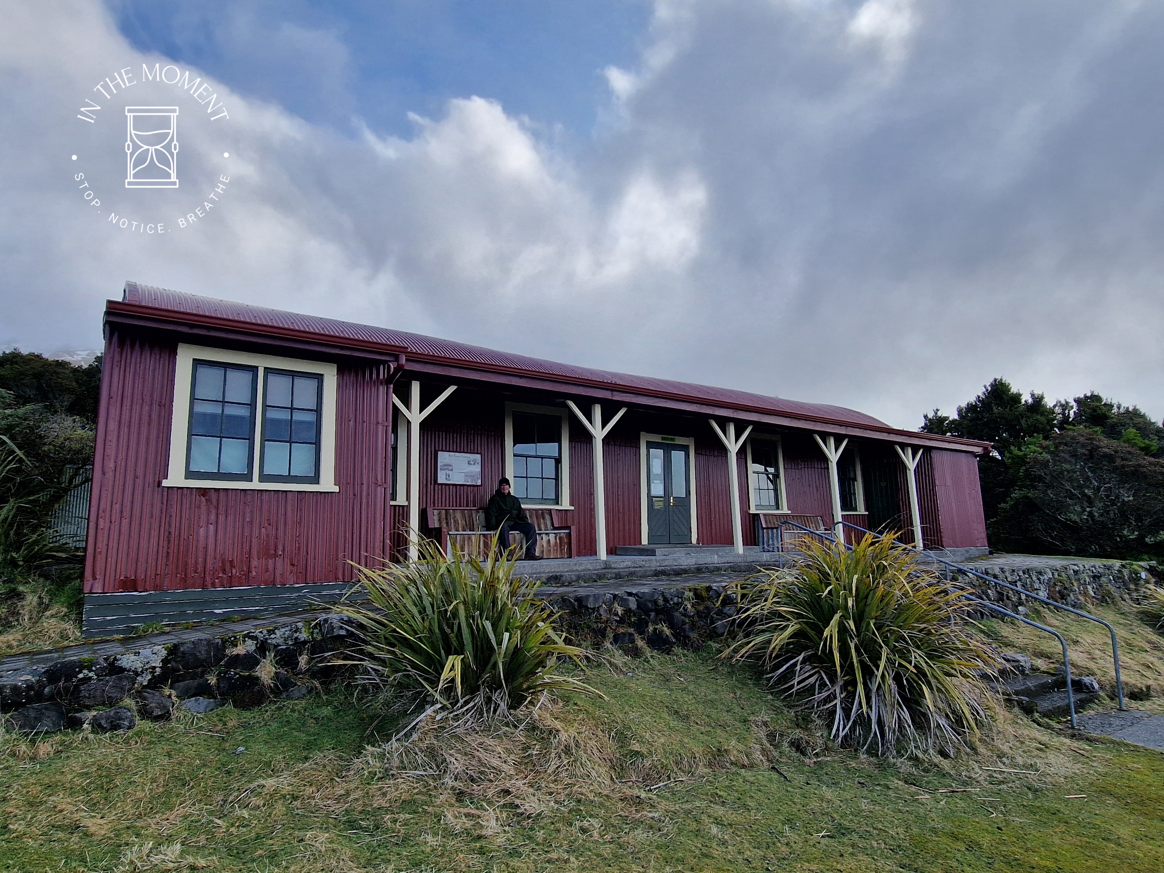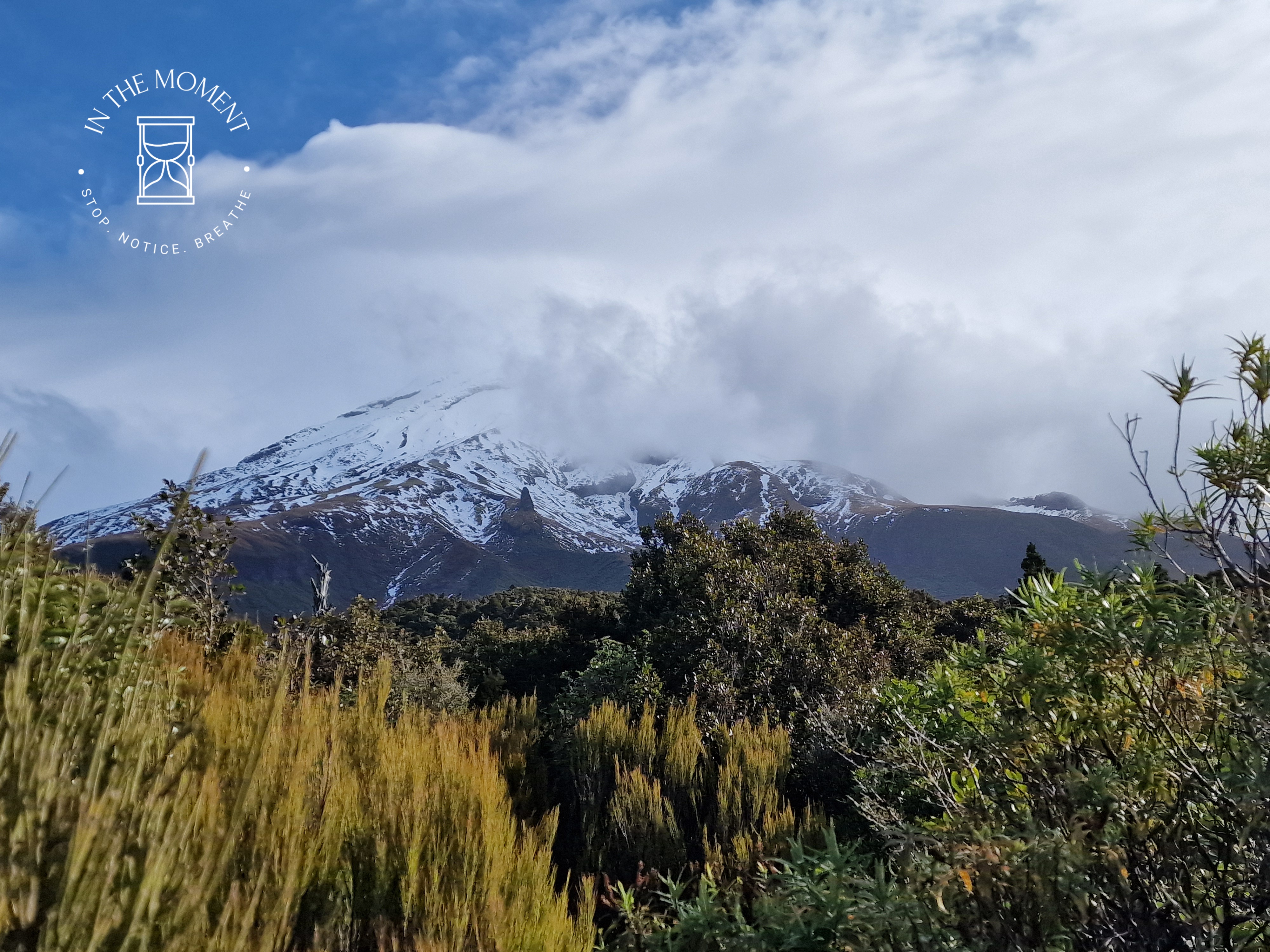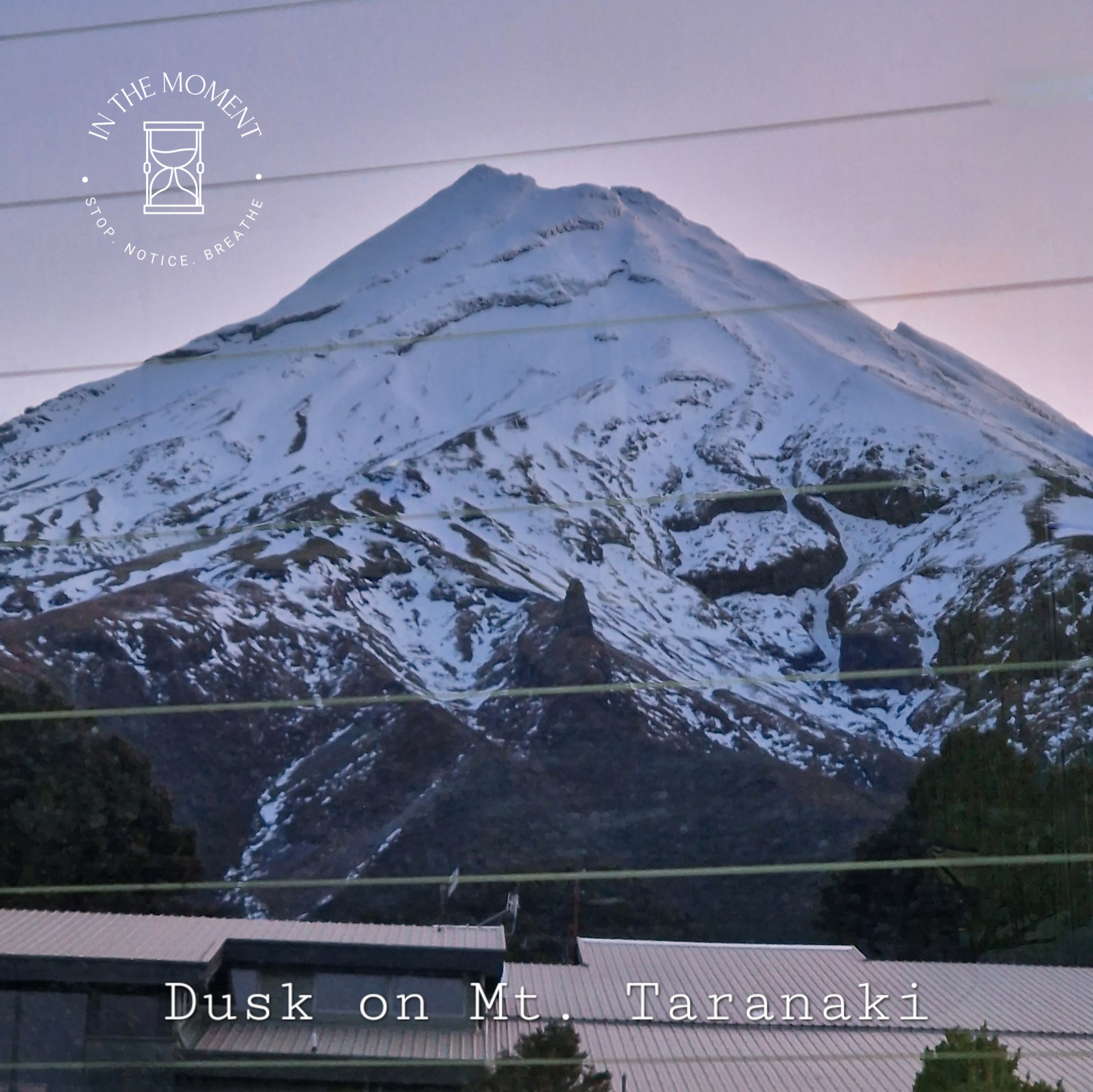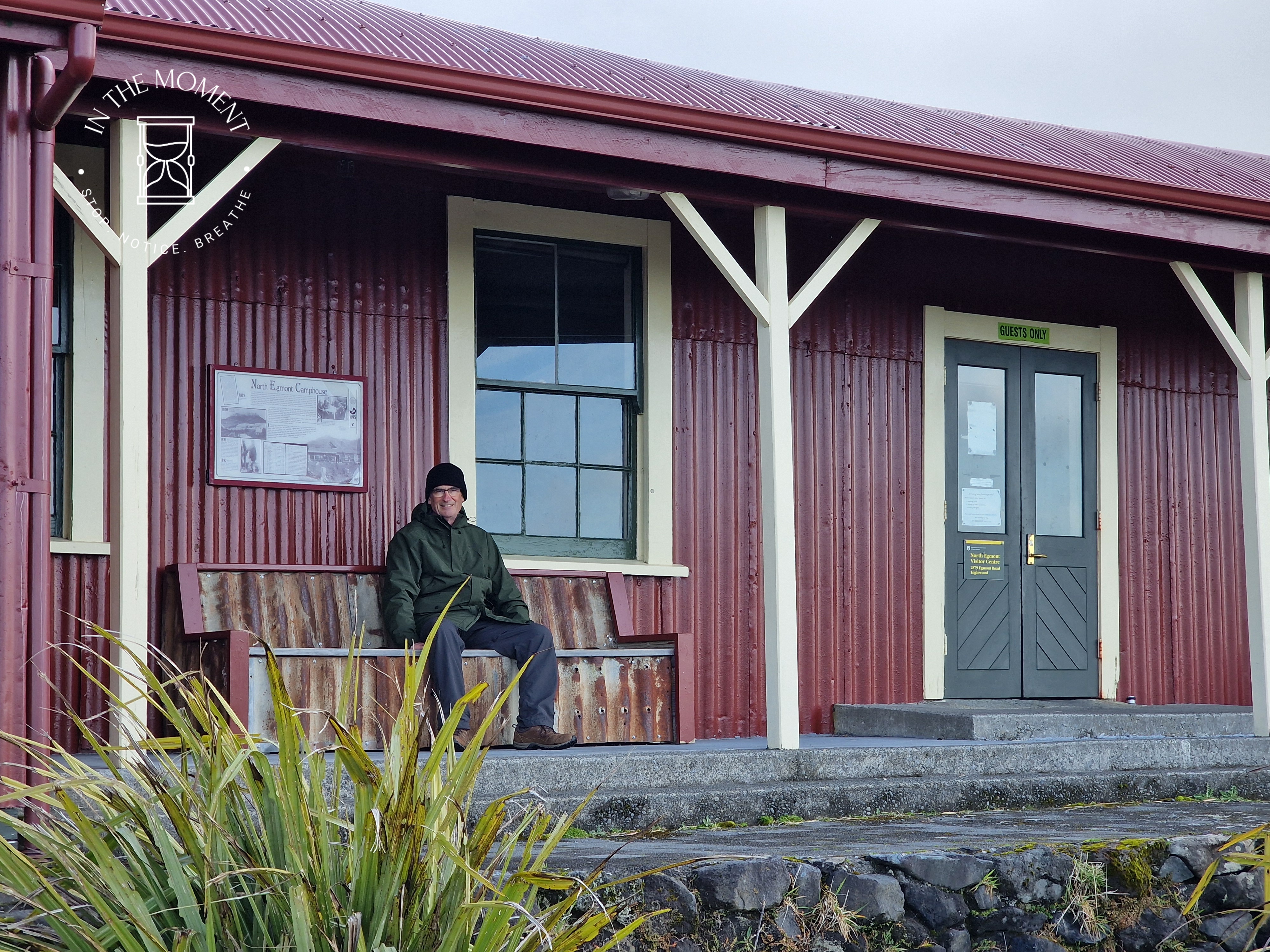 After stopping at one of Don’s childhood homes, we head up to Mount Taranaki. Don is driving this bit and thank the lord as it is twistier and turnier than a twisty turny thing! But what a view! Mt. Taranaki is hiding behind cloud but it’s beautiful and we go for a short bush walk. It’s blowing a gale and very chilly. The bush here is referred to as Goblin Forest because all the trees are draped in moss and lichens. At the end of the walk, we come across the old tramping hut. We decide to camp here on the mountain for the night and as we settle in, the clouds disappear and she finally says hello…