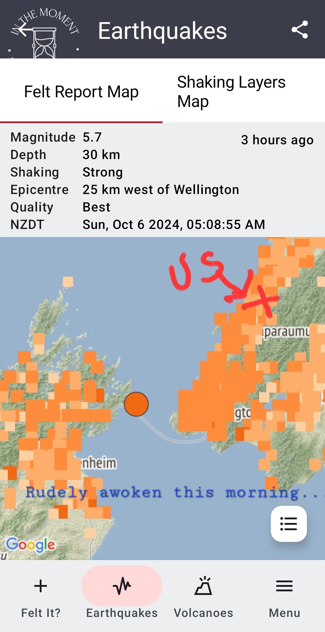 It had been a quiet evening, the odd car going past. Sometimes kids think it’s fun to make lots of noise, rock people vans – scare the tourists kind of thing. So when in the early hours the van started rocking my thought processes were as follows: 1. Windy. 2. Kids. So I listened for noise of kids laughing. Nothing. No wind. An alternate thought, earthquake. Listened a bit more. Rain. So I went back to sleep. Later, as I was making breakfast, I checked my geonet app. 5.7 earthquake Wellington. No wonder we woke up!