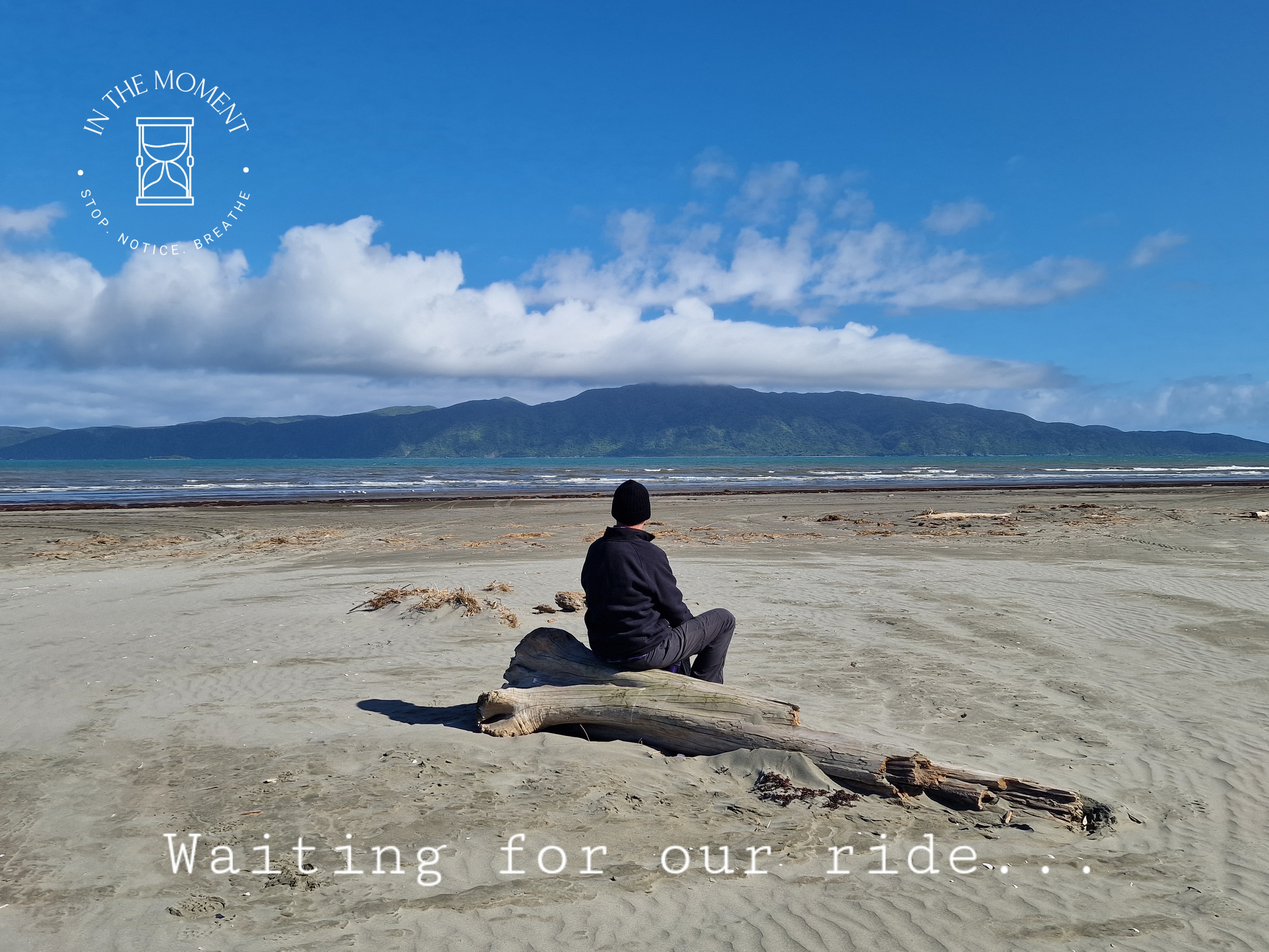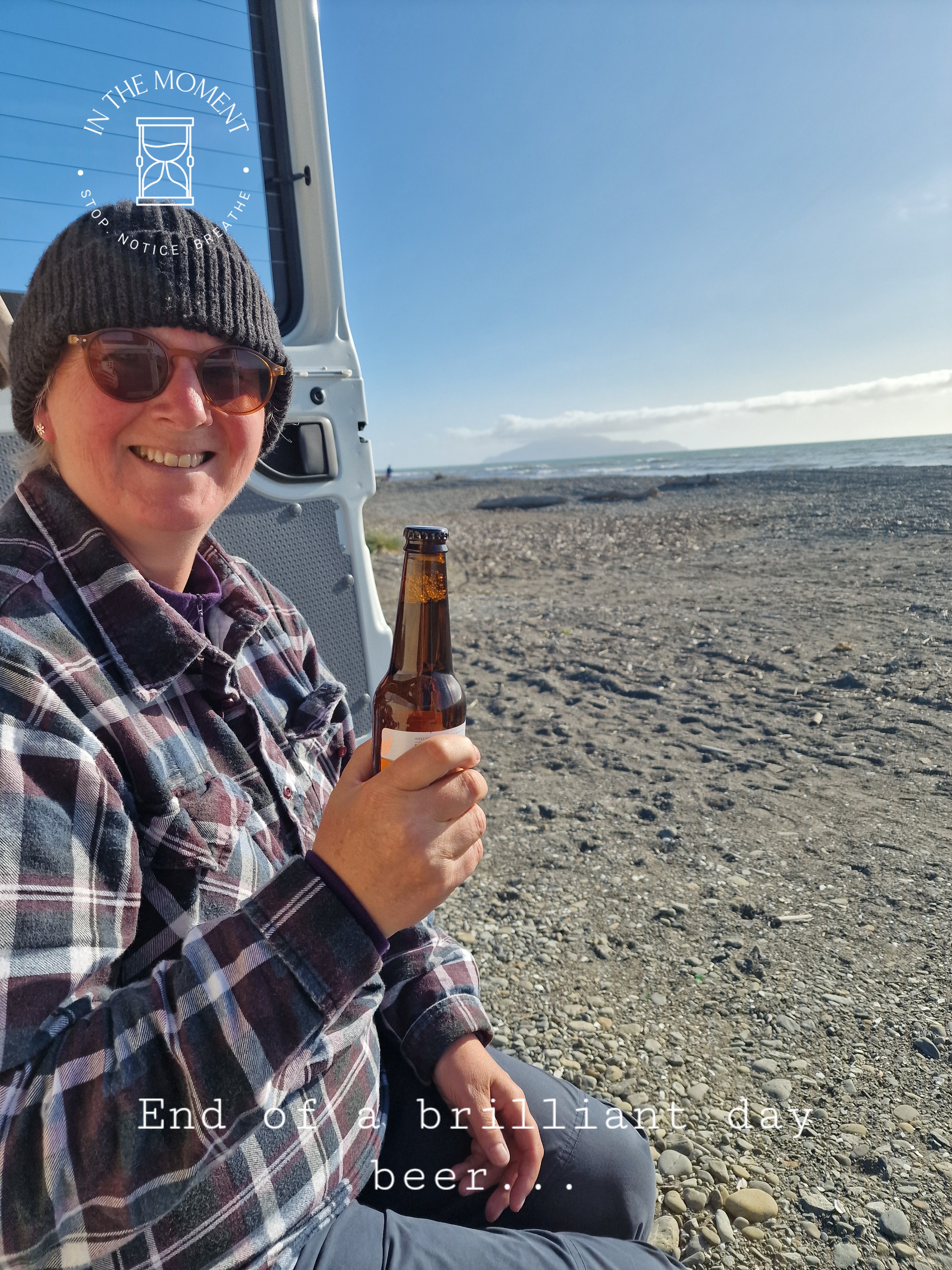 We camp for the evening right on the beach at Otaki and watch the sun go down over Kapiti, with a well earned beer!