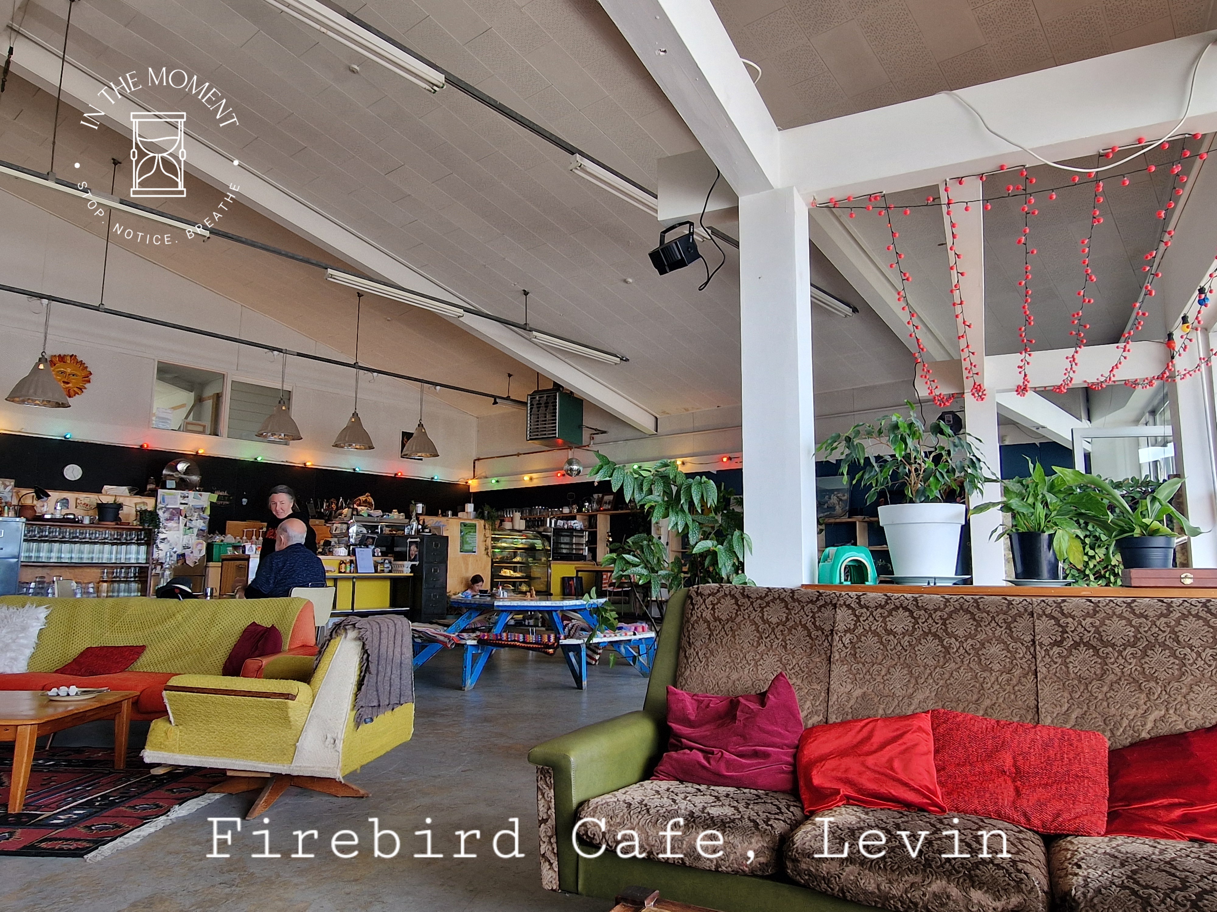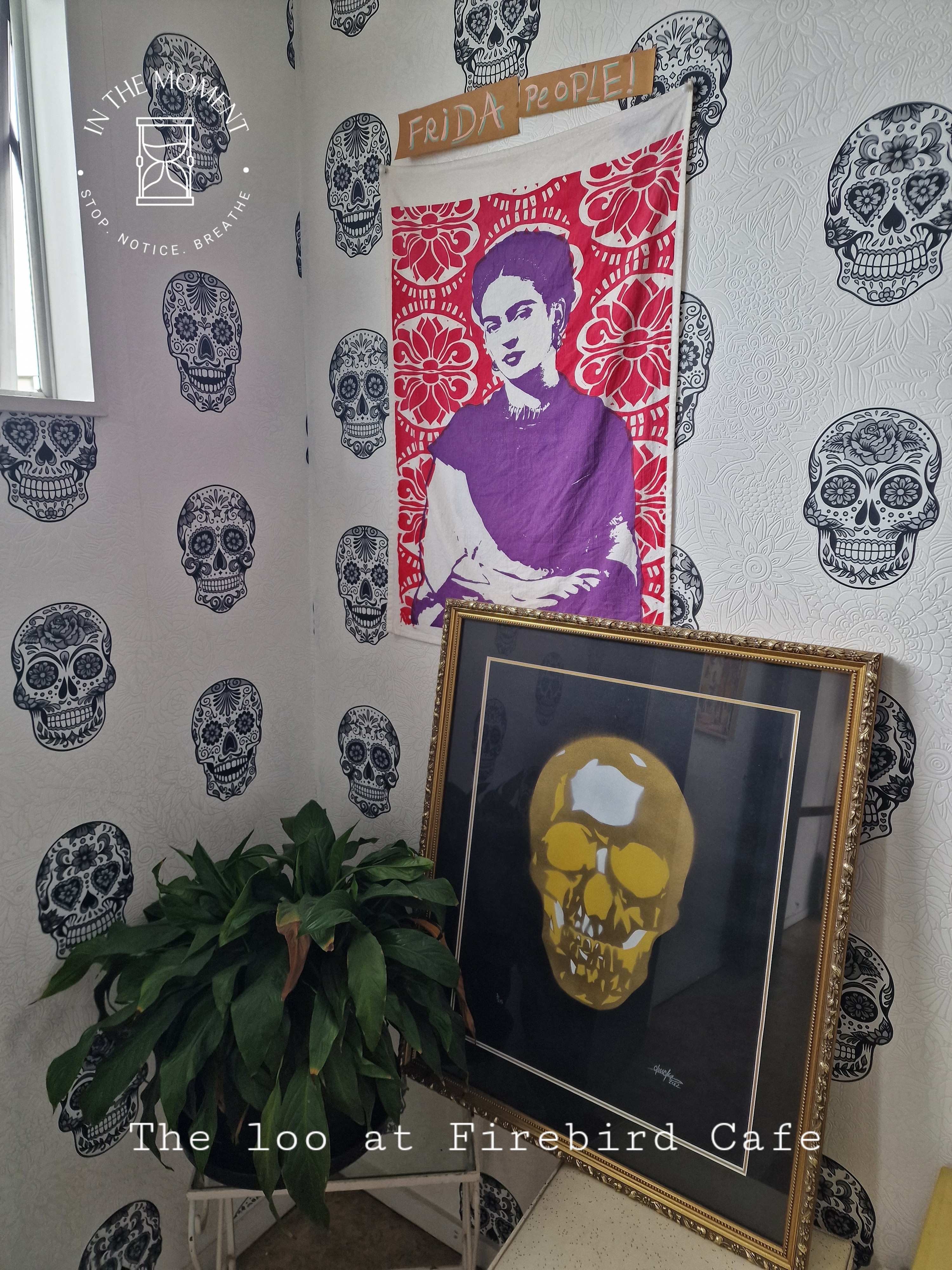 Quiet day today, driving from Otaki Beach to Fielding. It was overcast at the start of the day and torrential rain by the time we pulled into our camp spot. Ah well, NZ spring! We have a last look at Kapiti from the other side and head off. In need of coffee, we stop at a cafe in Levin called Firebird. OMG! What a quirky, brilliant place. Great flat whites. Great treats – Don had Basque Cheesecake which he said was: “bloody good!” I had a cheese and kimchi scone which was the fluffiest scone I’ve ever eaten. And if that wasn’t enough, the wallpaper in the loo was day of the dead!!