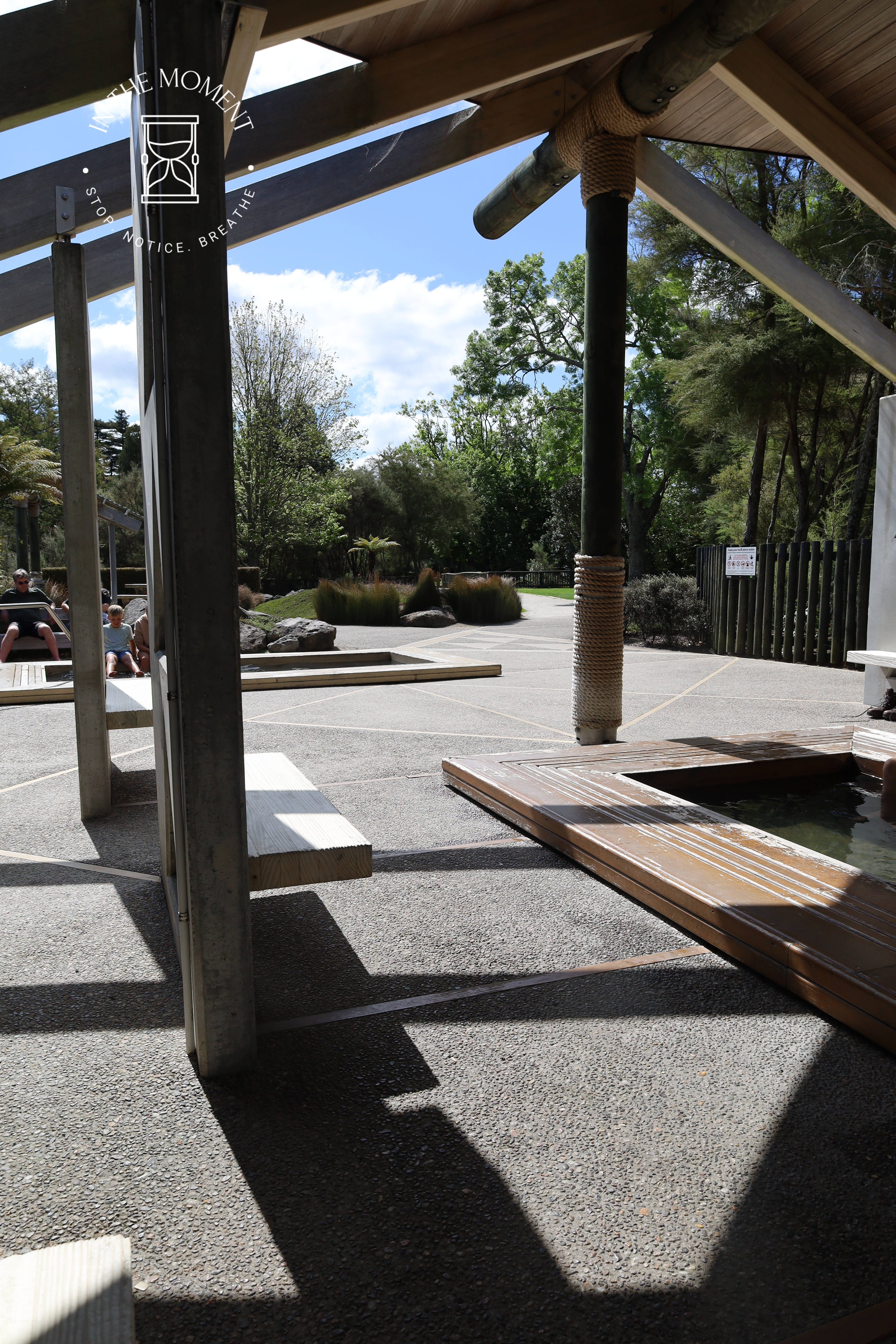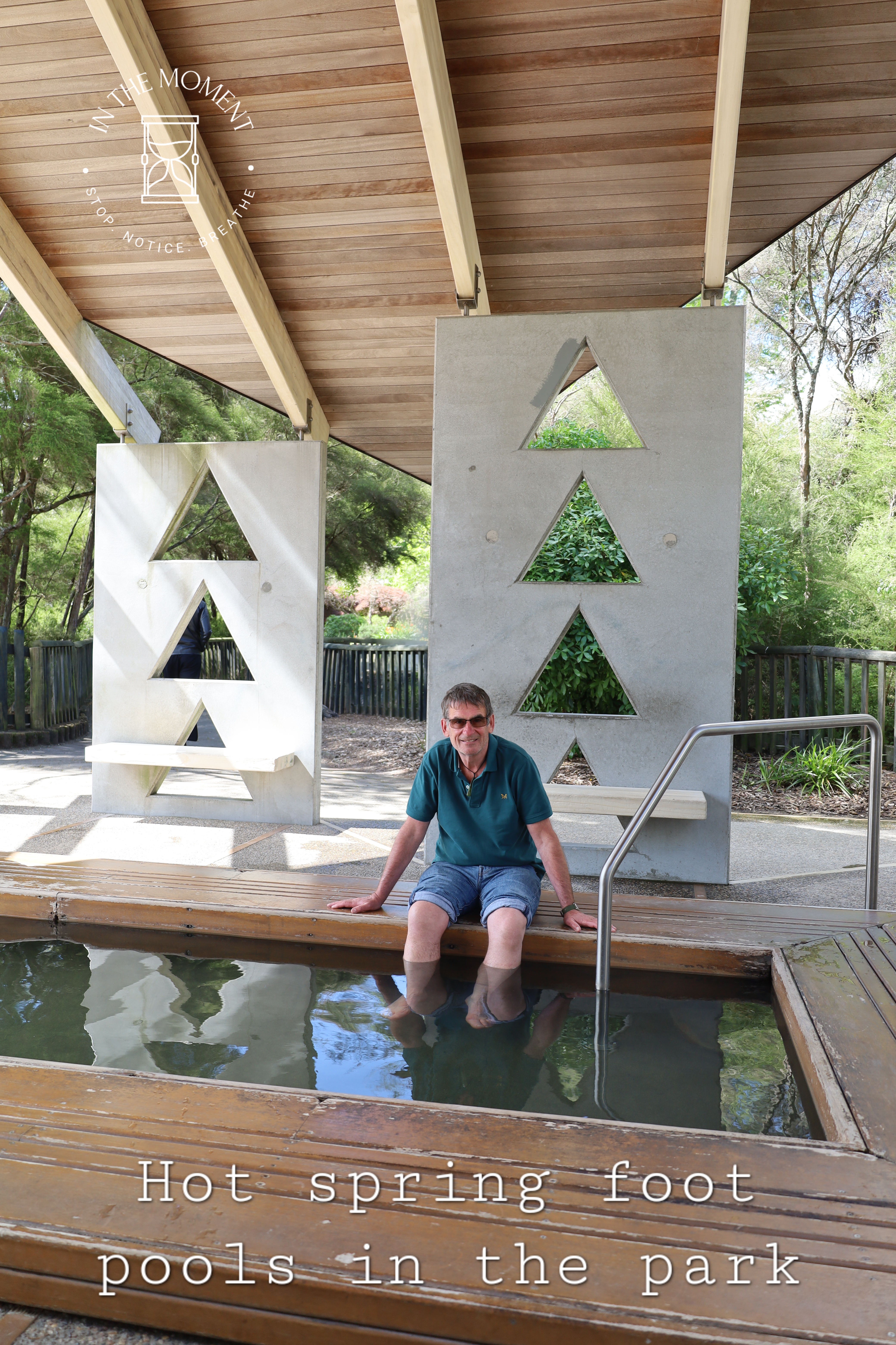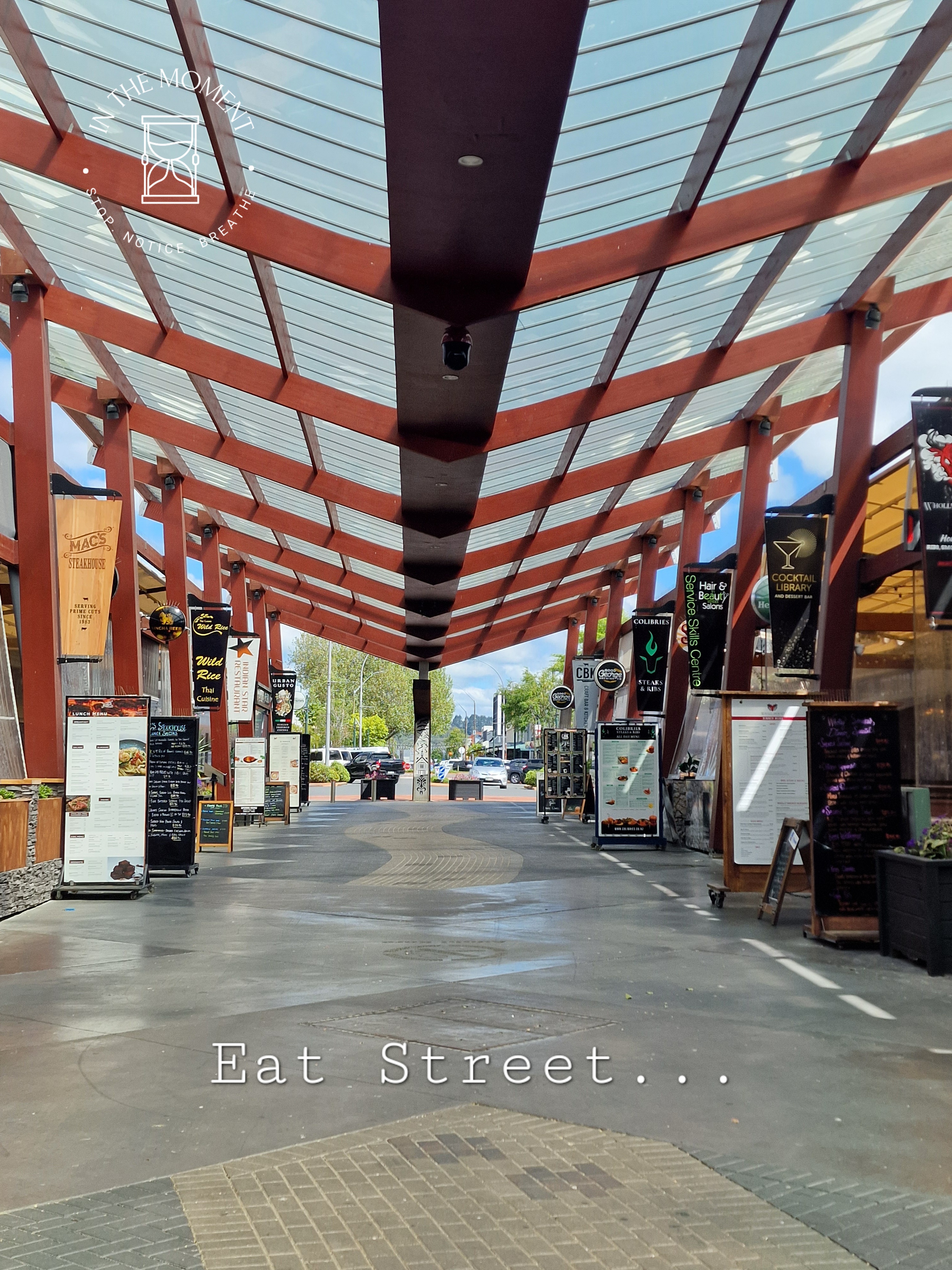 Rotorua is truly an assault on your senses the moment you open your car door – or van in our case! Not only are there steaming holes and mud pools in the parks, alongside the famous Sulphur Point on Lake Rotorua itself, there is the smell. Now. Some reviews of places in and around tell you how beautiful places are if only it didn’t smell so much…duh, you are in Rotorua! Due to the very highly active geothermal activity here, there is a smell of sulphur in the air. Is it dreadful? No. Is it strong, sometimes. Should it stop you enjoying this totally alive place? ABSOLUTELY NOT! Rotorua is a wonder. There are signs in the parks and other places of interest telling you NOT to leave the footpath due to the high levels of activity and the proximity to the surface of hot springs, steam vents and boiling mud pools. It is a reminder of just how thin the earth’s crust is here. We absolutely love Rotorua. Our walk around the lake and Government Gardens was fascinating. There are sculptures everywhere, stunning street art and of course the geothermal activity. We walk up to Ohinemutu which is a living Maori village where we see the Te Papaiouru Marae. It is a stunning building. There are a huge number of steam vents and hot springs in this village and the geology of the land is reflected in the cemetery where the graves are above ground because of the thermal activity. Further on our walk through Kuirau Park, we treat our tired feet to a soak in the public footbaths (see photos) and what a treat, even if Cath did get her jeans soaked! Our lunch stop was on Eat Street, one part of a long street that covers about four blocks. Eat Street’s only business are eateries and to make this experience even more enjoyable, this particular part of the street has a covered walkway against the weather.