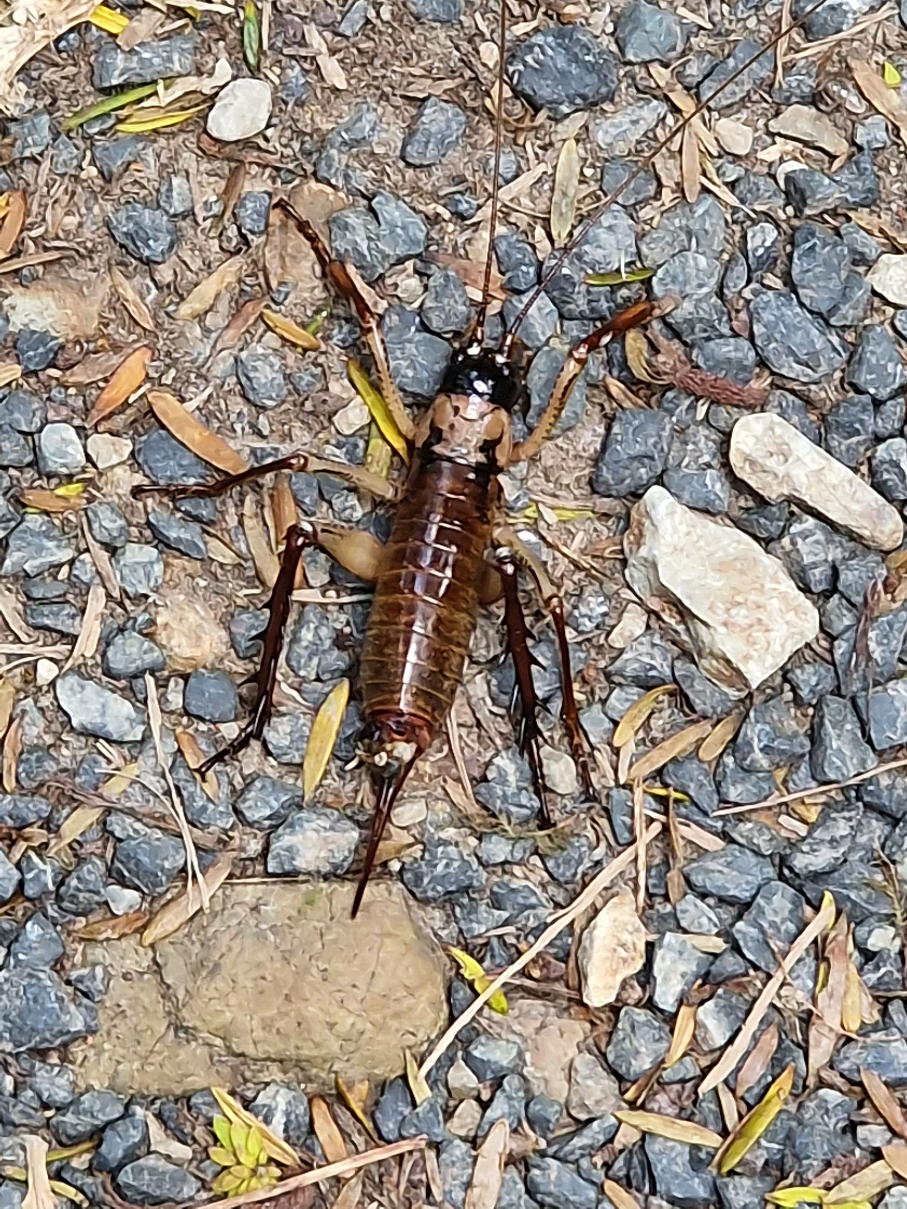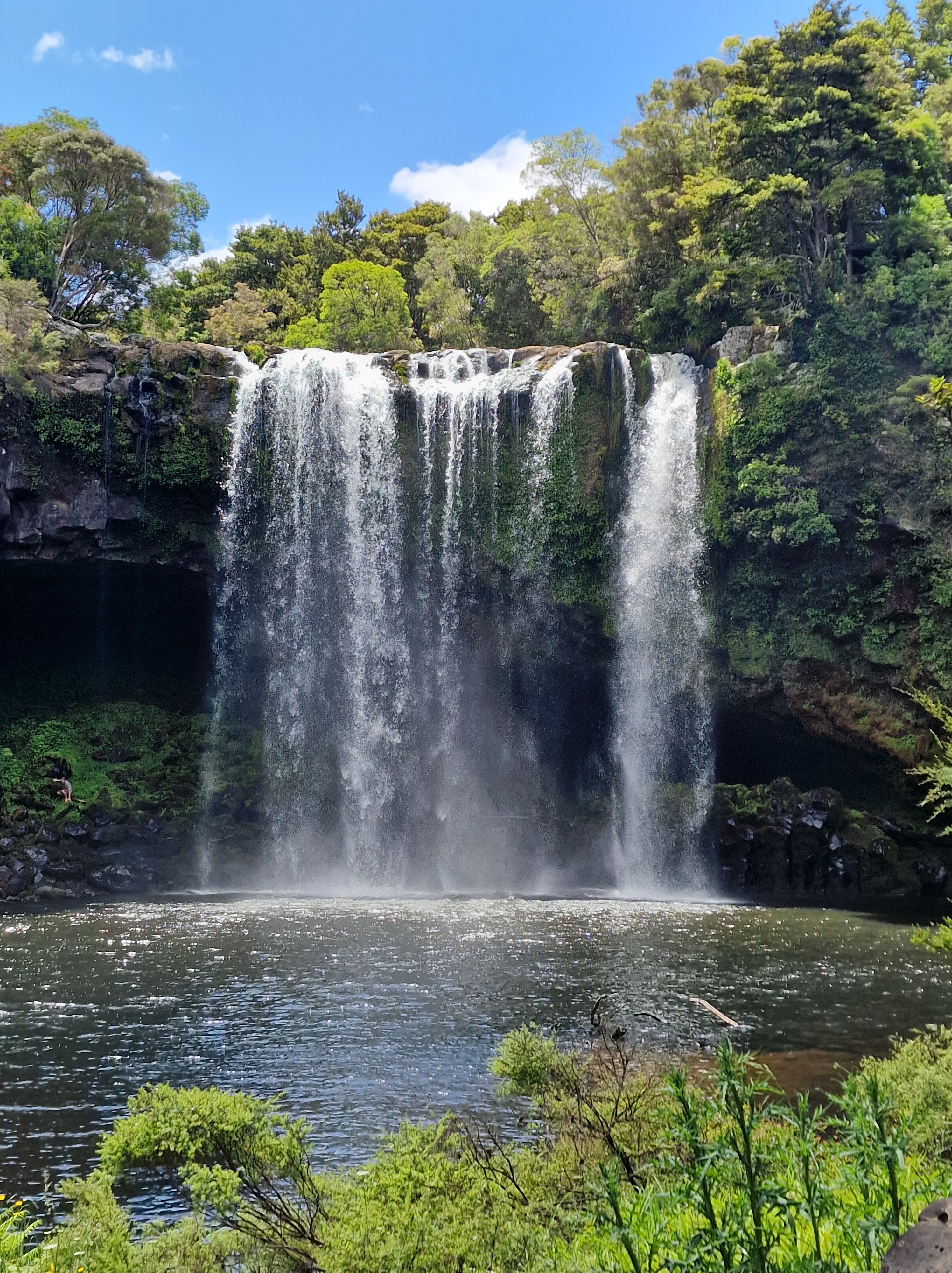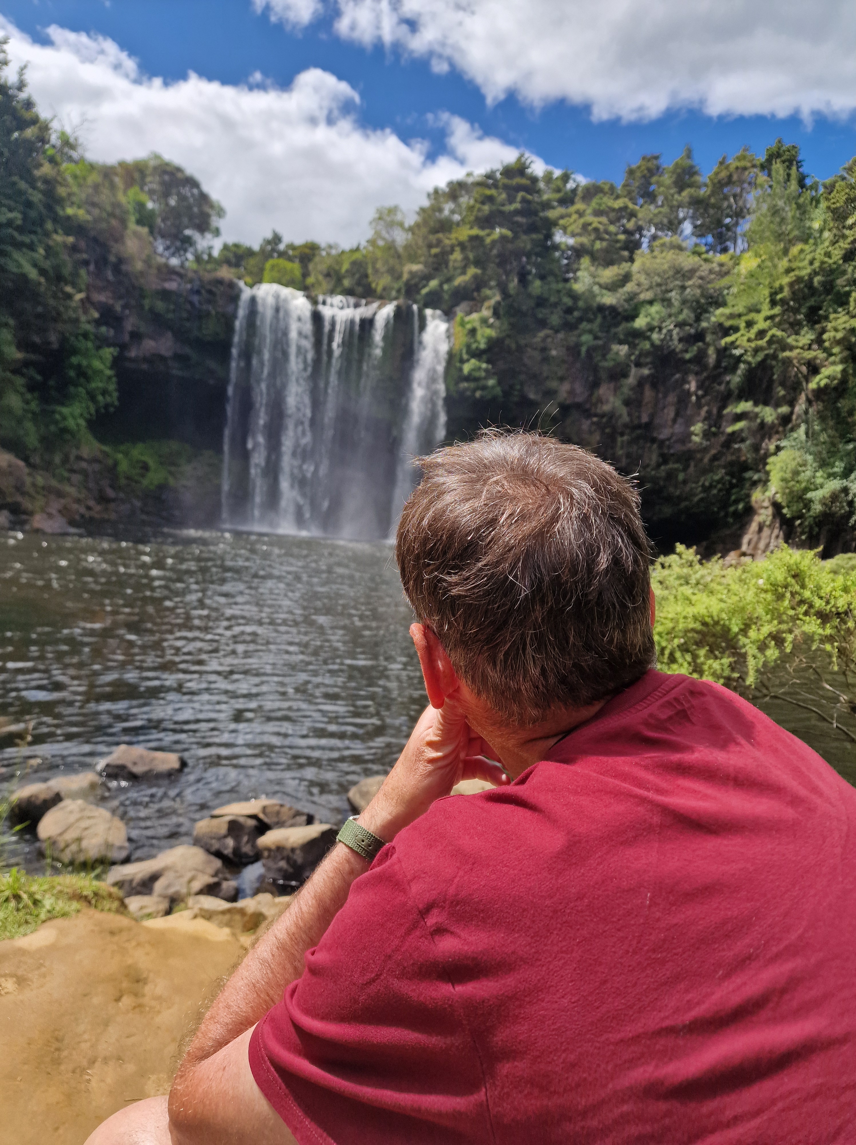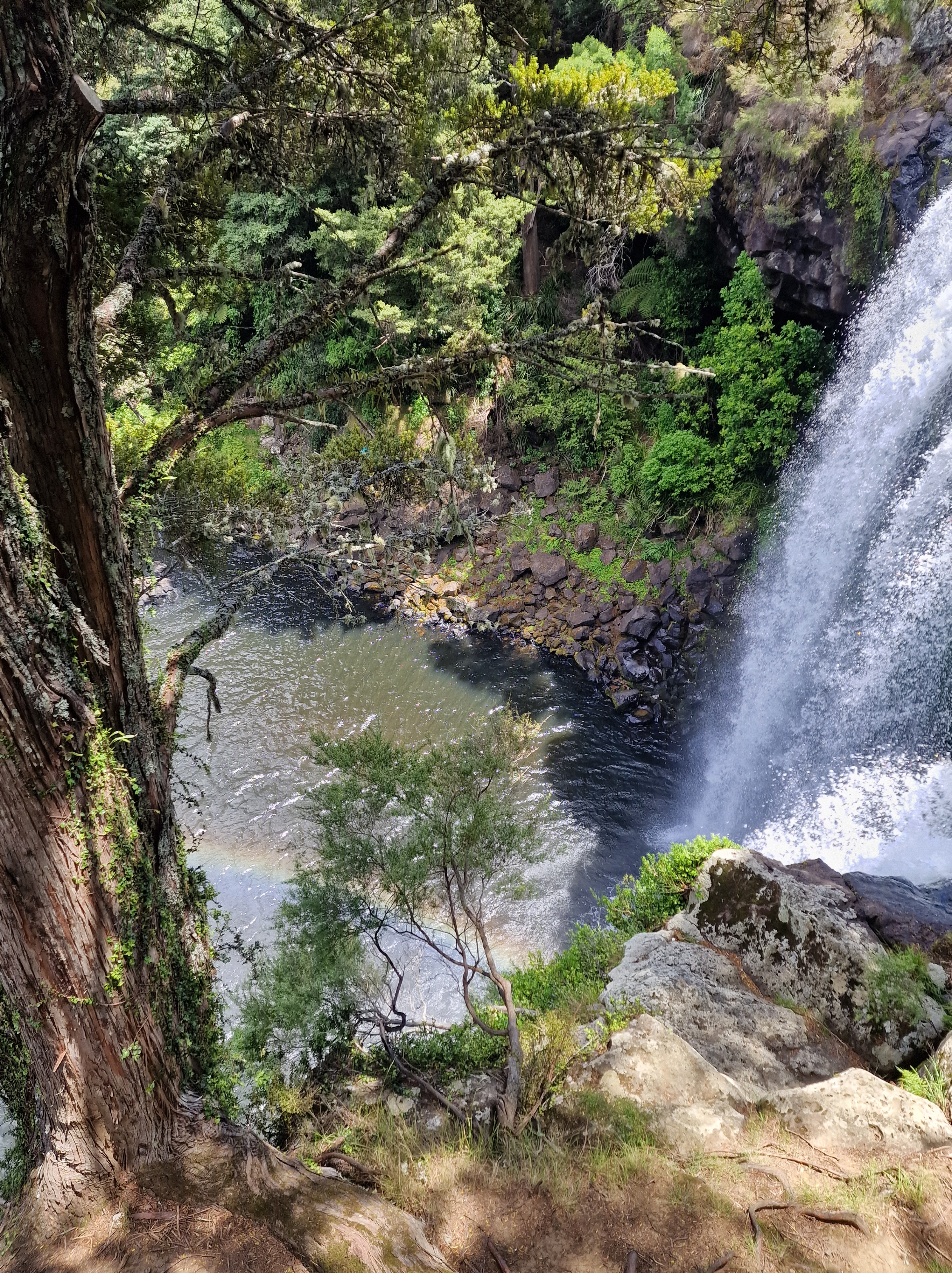 We are in Kerikeri. This part of New Zealand is famous for it’s sub-tropical fruit production and we pass many orchards growing oranges, lemons, avocados, kiwi fruit & tangelos. We spend two nights at the NZMCA site at Rainbow Falls. Our walk to see the falls takes all of two minutes over a fence! What spectacular falls they are. And yes, there is a rainbow – just. We have a walk along the river, through kauri trees and spot a weta on the path – unusual as they are nocturnal. We manage to move it from the footpath back into the bush.