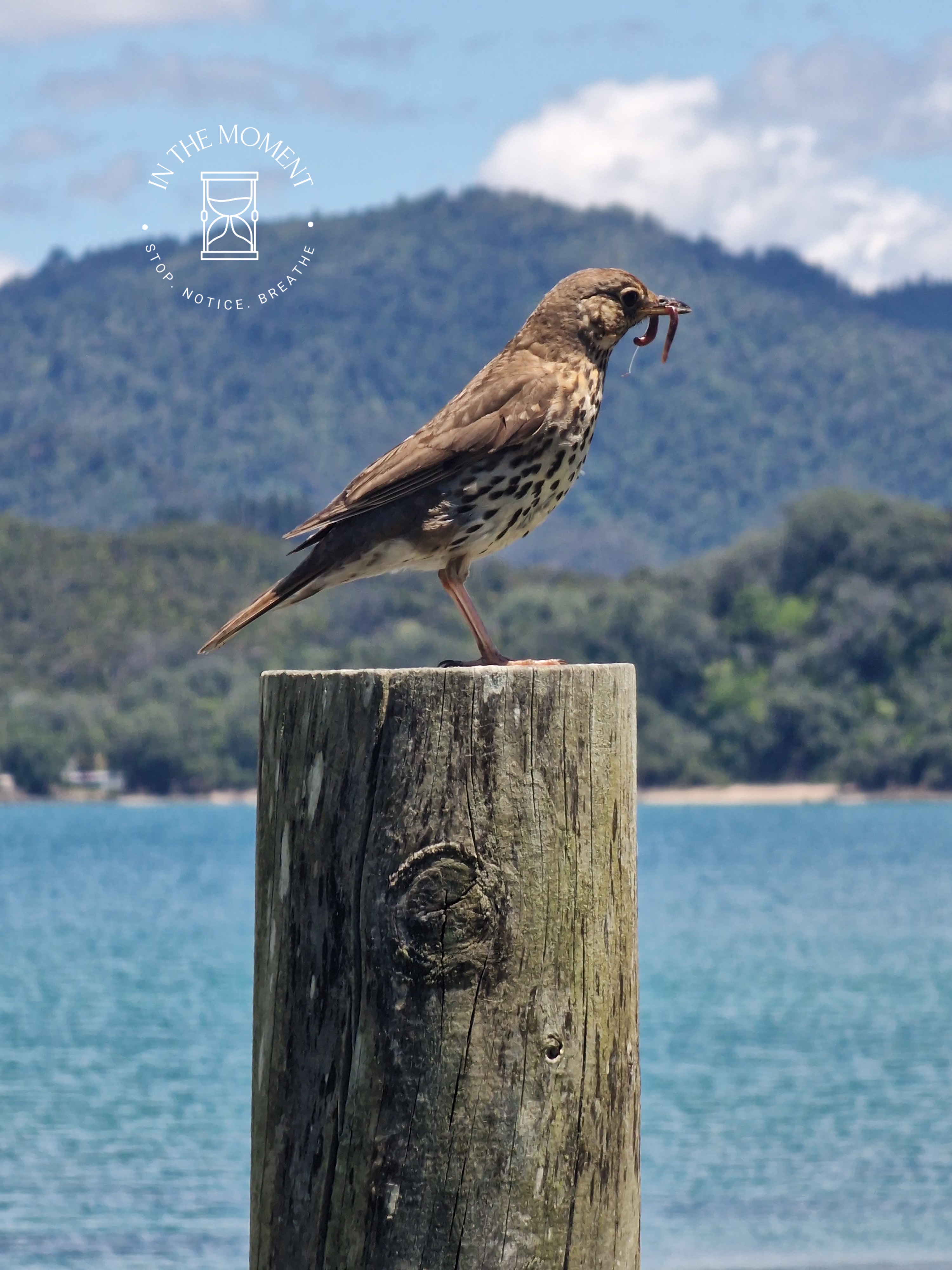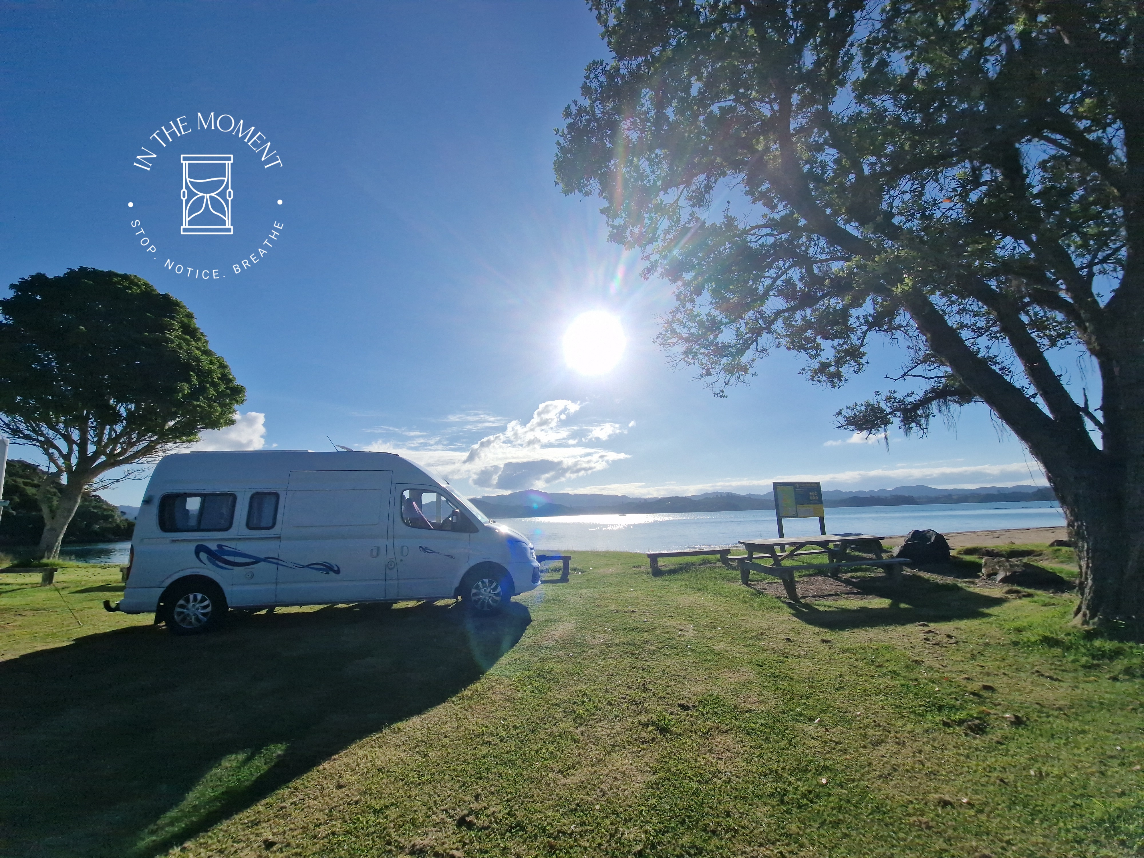 Puriri Bay, Whangaruru North – is a little slice of heaven! It is a DoC campsite with soft golden sand, gently lapping waves and so many different birds to see. We are camped right on the beach front and it isn’t too long before you become mesmerised by the skill and speed of the gannets who spy their prey from meters above and then dive with a spectacular splash into the water to get their catch. No chance of catching that on camera! We also see a family of Quails – the babies are cute, a thrush that kept coming to show us the worms it had caught but I think our favourite had to be the Oystercatchers who also had babies, three to be exact and oh man are they cute! This bay is teeming with wildlife – we also saw small sprats jumping in the shallows, possibly to escape the short tailed ray that was looking for something to eat. It was really interesting watching how the rays (there may have been two or more) manoeuvring the sprats in order to catch them. We had a swim here as the water was so inviting – this was before we knew there were rays about! The sunset here was stunning. We had cold water showers in the morning – quite liberating having a shower in a room with no roof and being exposed to the elements!