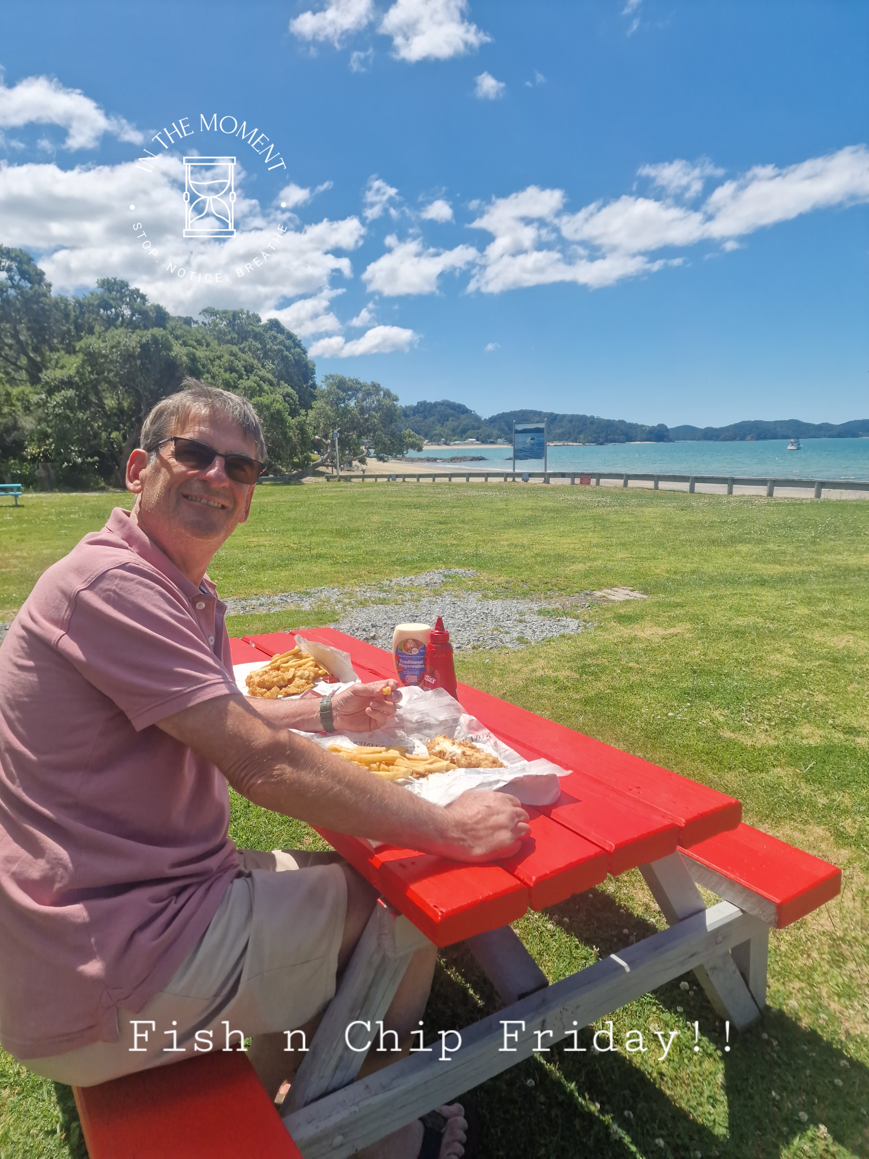 We spend one night at Whangaruru South and as it is Friday, we have fish and chips looking out to sea…