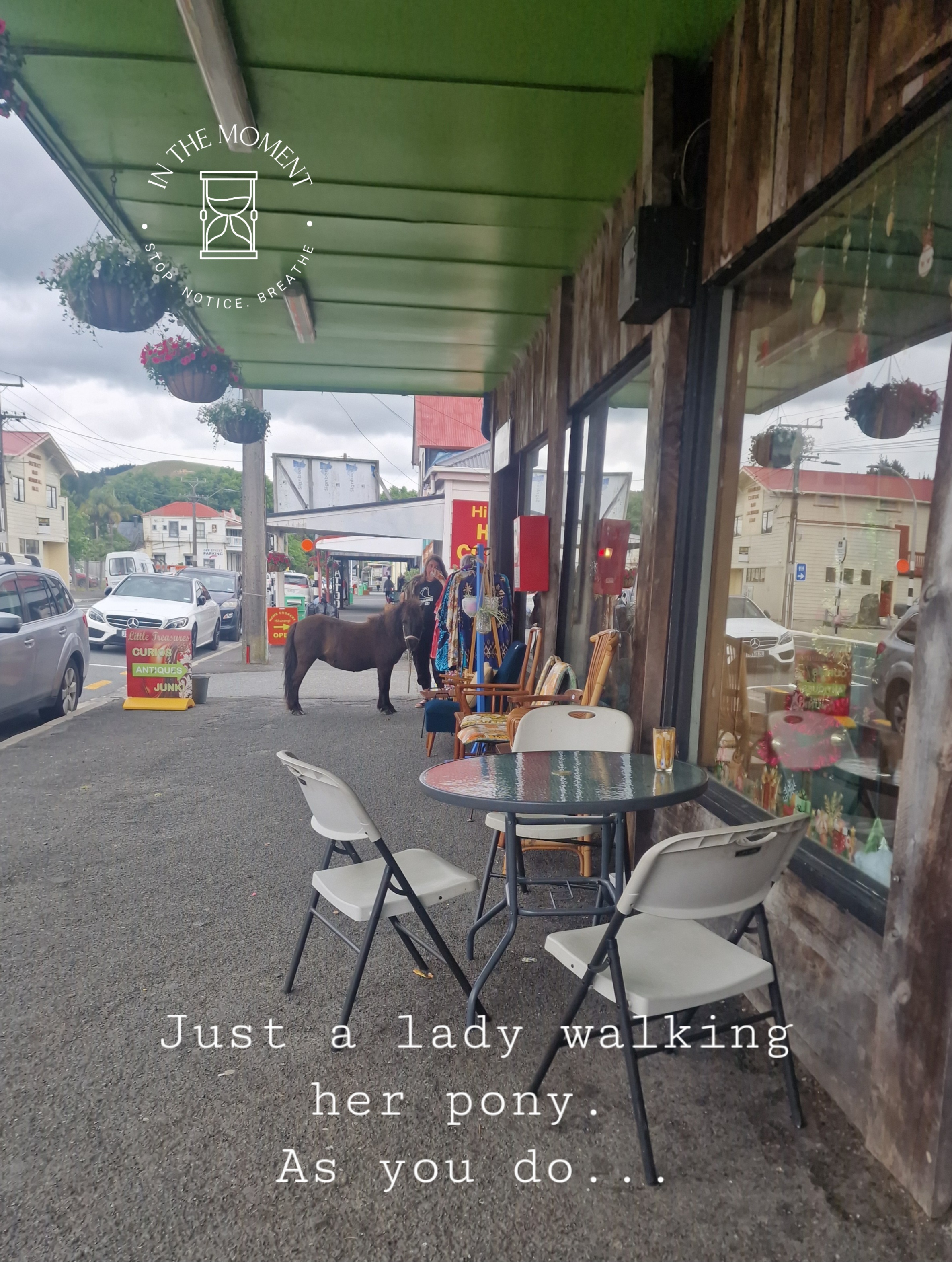 On our journey along the coast, we stopped to pick up some groceries and a coffee of course. Found some interesting second hand shops to fossick around in. Came out of the coffee shop to see a lady walking her pony as you do!
