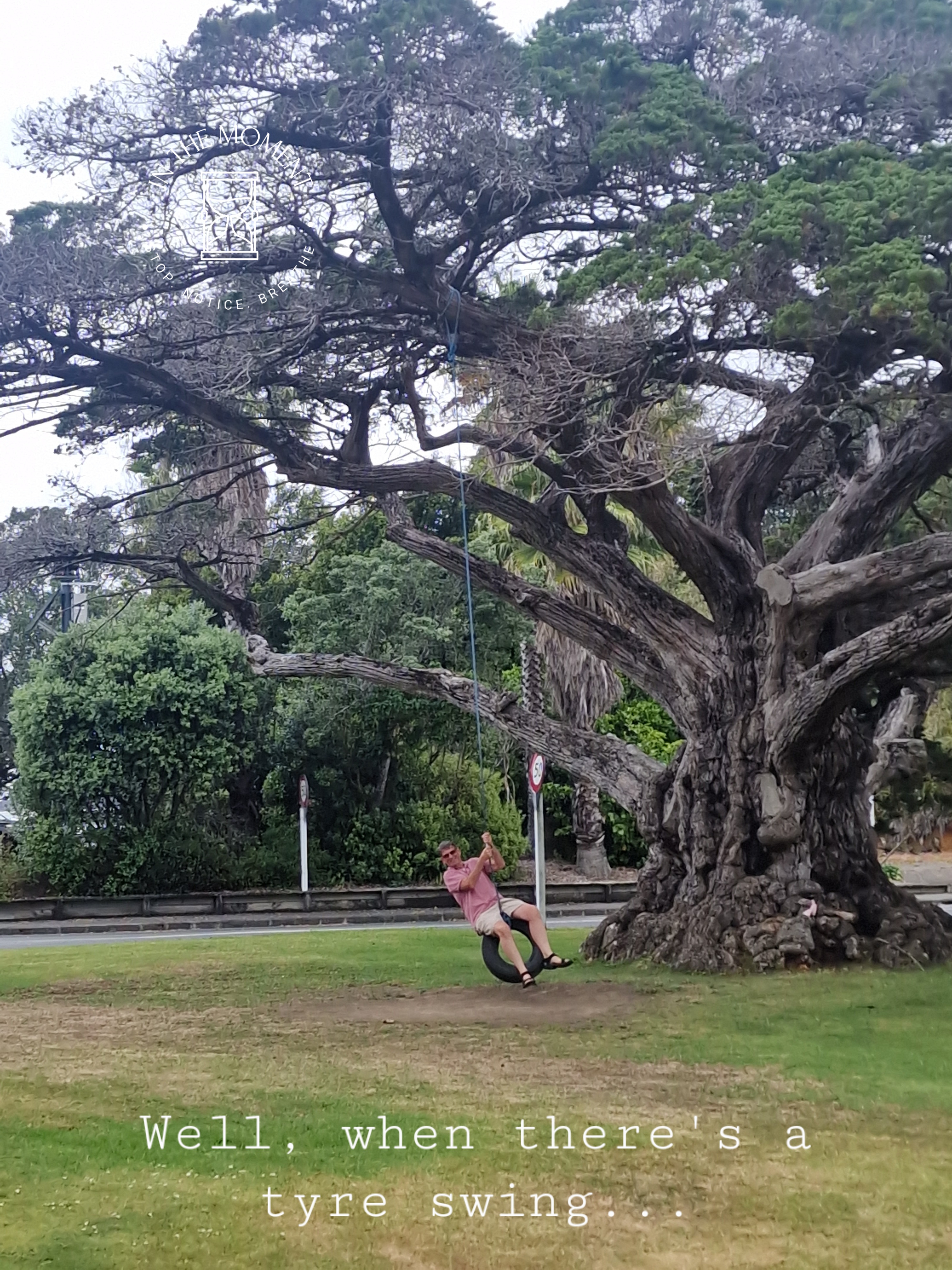 Tutukaka Marina – we book into the campsite early and have a wander down to the marina for a coffee. Oh my goodness, it is a very busy marina. We have a good stroll around the boats and then decide to have lunch in a place overlooking the boats. There is a friendly local short tailed ray here who has been here for years – there is even a local monument to him/her/it? Don just can’t resist a swing on the tyre under the most beautiful tree.