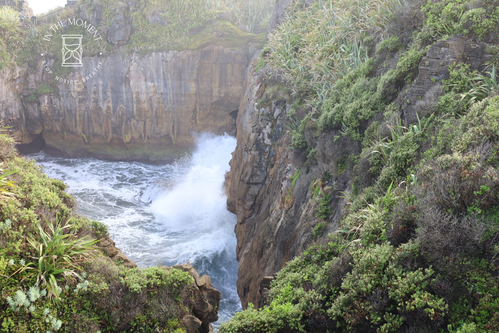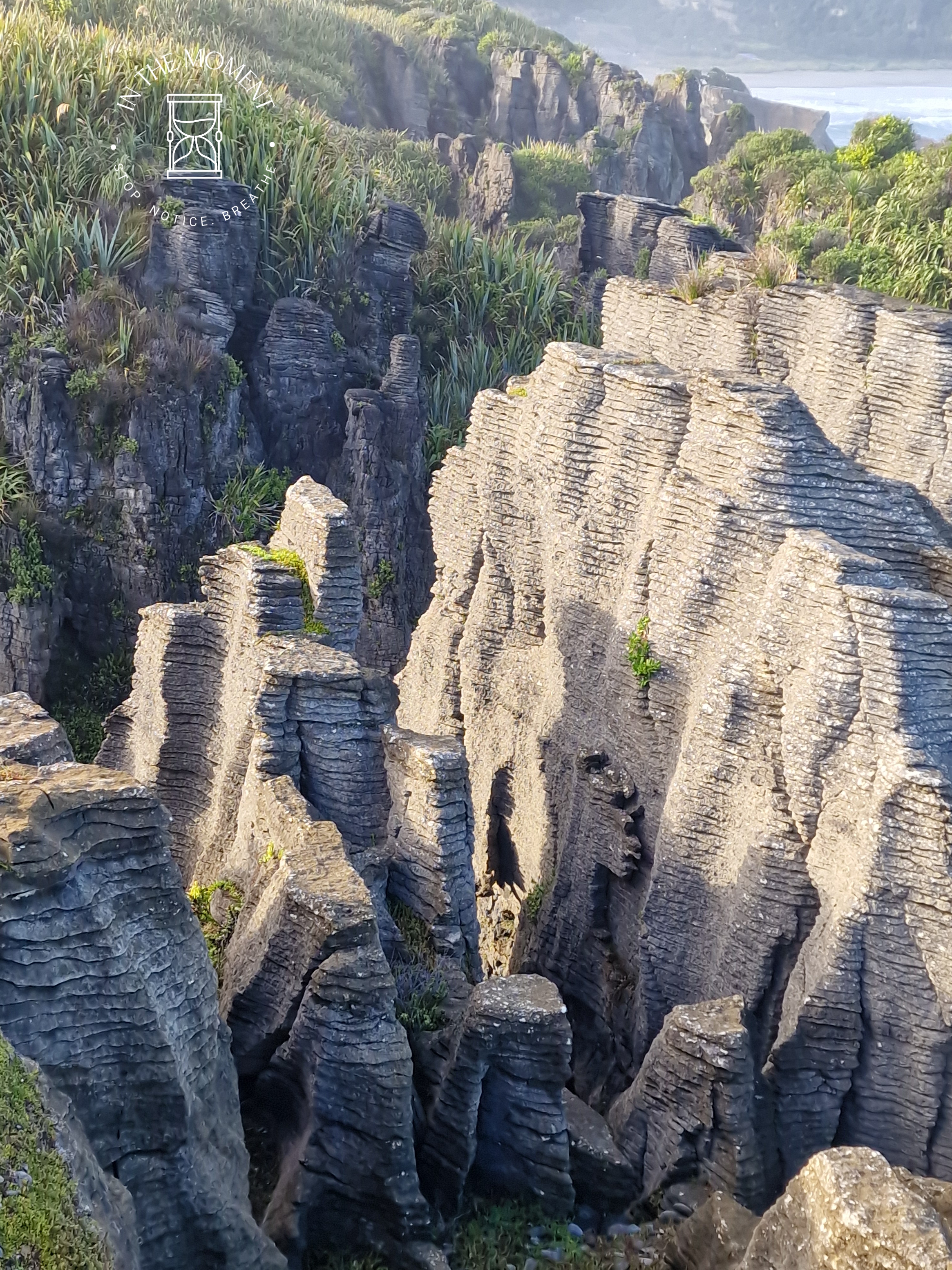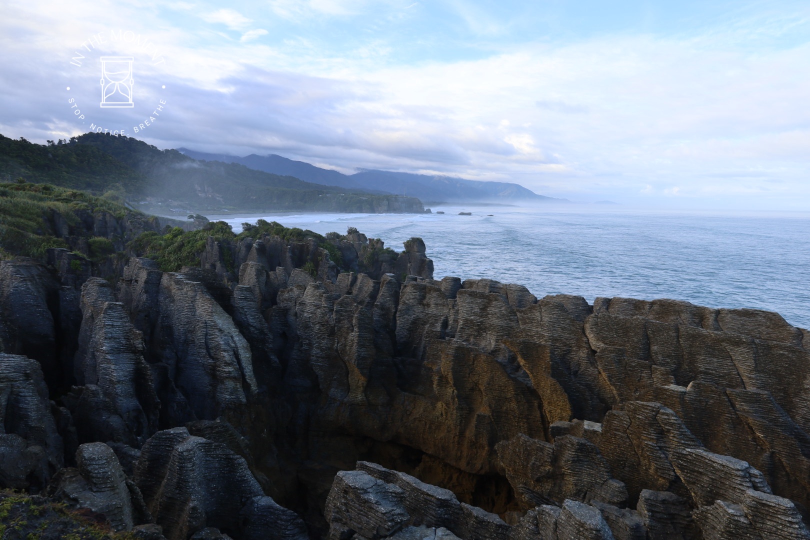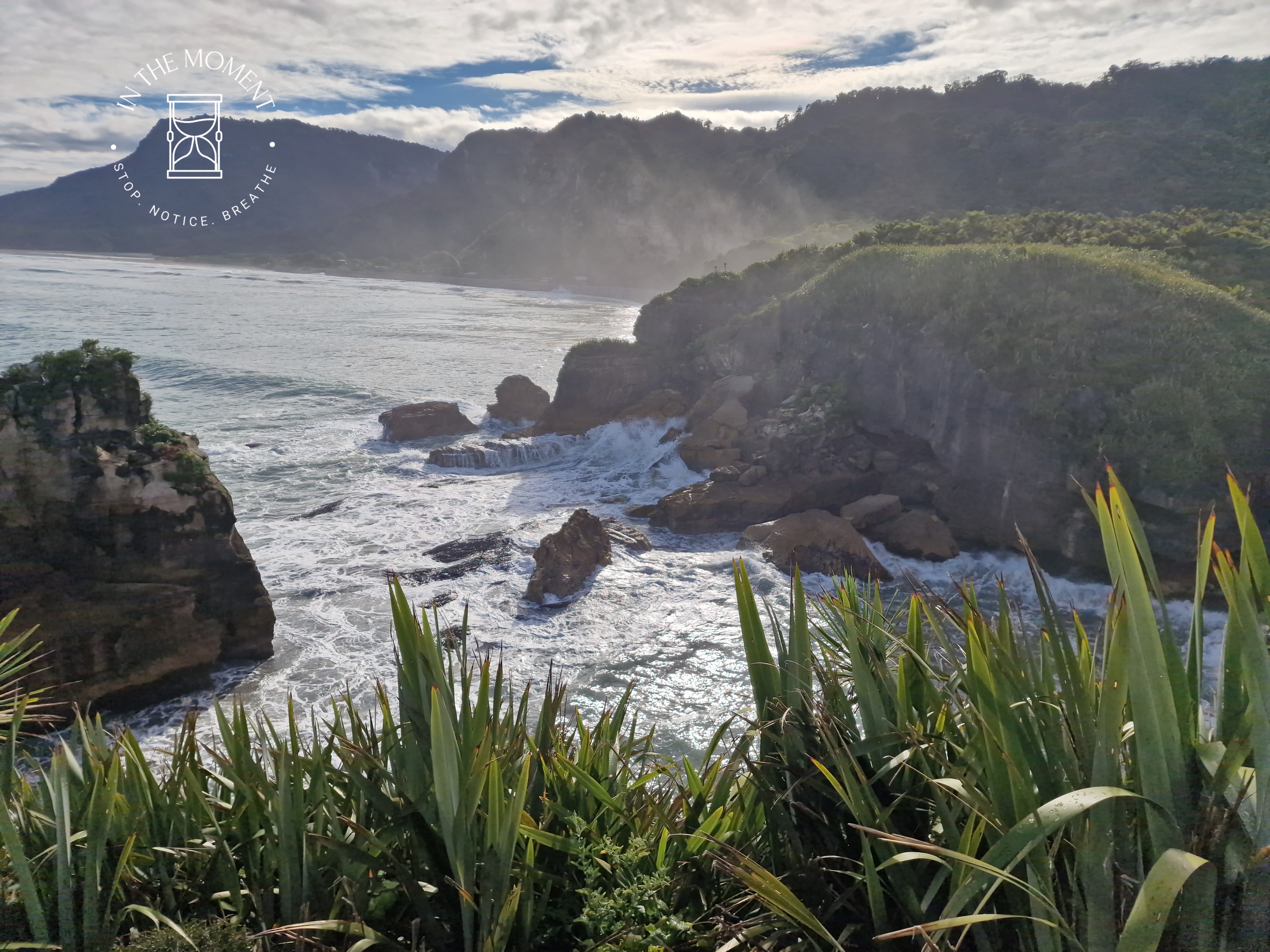 Punakaiki – We were up at the crack of dawn for our visit to Punakaiki (Pancake Rocks) as the best time to see them is when it is high tide and preferably when there is a big sea swell. You are led on a very neat path along a loop walk that makes sure you get as many opportunities as possible to see and hear the sea smashing against the rocks. The ‘Pancake’ effect is caused by millions of years of limestone and papa rock layering. This walk is a real assault on your senses. Sight, sound, smell. Huge booms as the waves break against the rocks, sea spray exhaling from the ‘Chimney Pot’. It was so amazing. There was one place where as we walked past, there was this really loud intake of breath type sound and then another like an exhale – but no water in sight. Didn’t see the sign that said – BEWARE SUDDEN LOUD NOISE. Had a lovely coffee with some cheeky company at the visitors centre after.