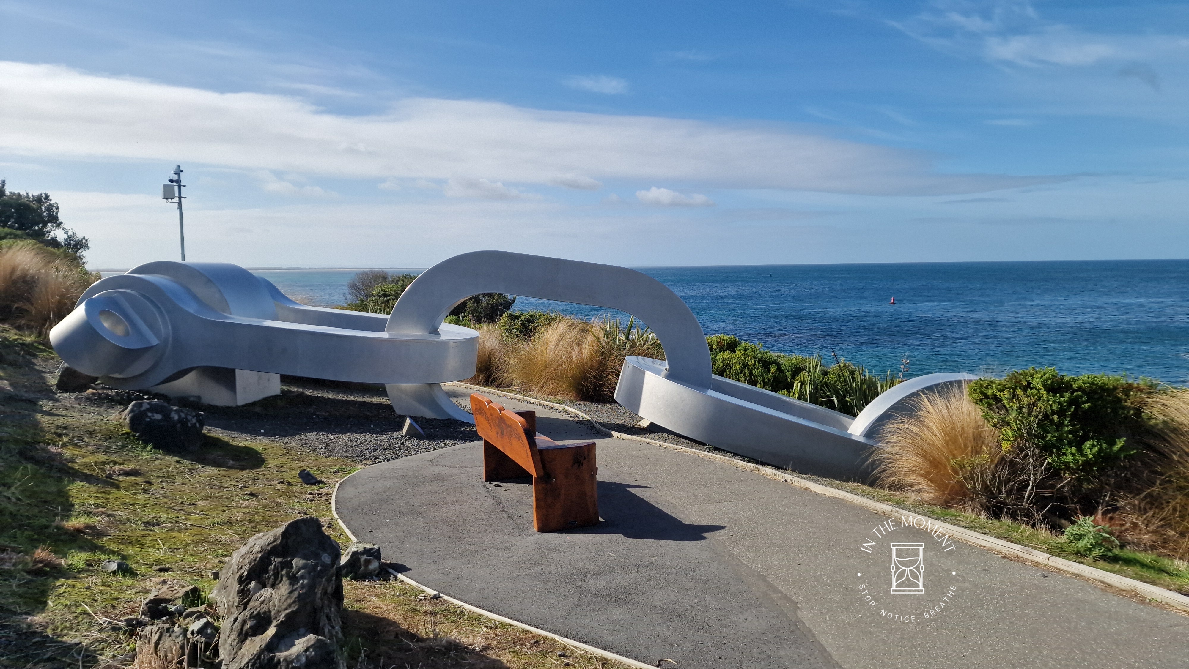 Maori creation stories tell how Maui, a legendary Polynesian voyager, pulled up from the sea floor the anchor stone Te Puka a Maui (Stewart Island/Rakiura) to act as the anchor for the great ancestral canoe Te Waka o Aoraki (South Island of New Zealand). A huge steel sculpture of an anchor chain was created by Russell Beck and it seemingly disappears under the Foveaux Strait. The other end of the chain, a twin sculpture, lies on the coast of Stewart Island at Lee Bay, the official entrance to Rakiura National Park and is a symbolic link between the mainland and Stewart Island.