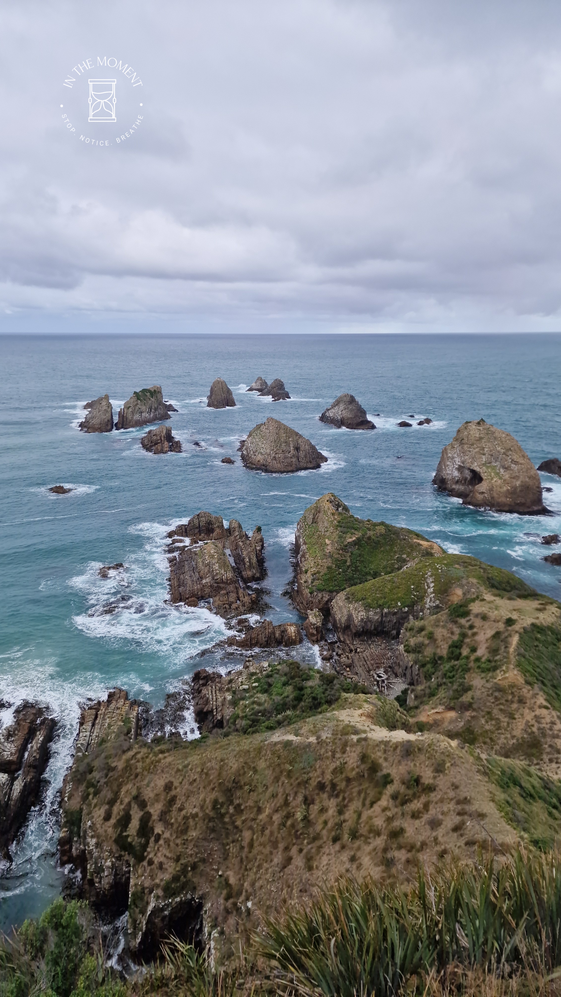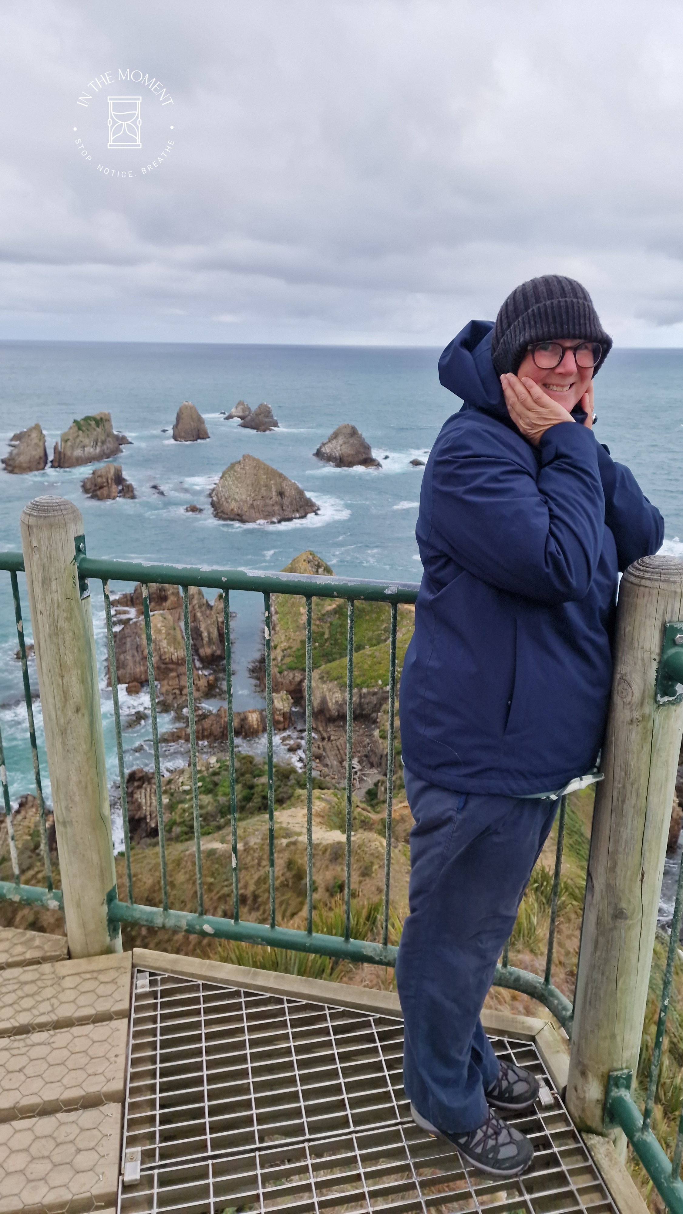On finally to Nugget Point where we walk up to the lighthouse. On the pathway up to the lighthouse which runs at the top of the cliff face, the trees grow as if blown upwards from the bottom and they then form a kind of tunnel over the path. You can really see why it’s called NUGGET Point when you look out at the rocks from the viewing platform. If you want a real rush, go and stand on the metal grating. Just hold on to your hat!