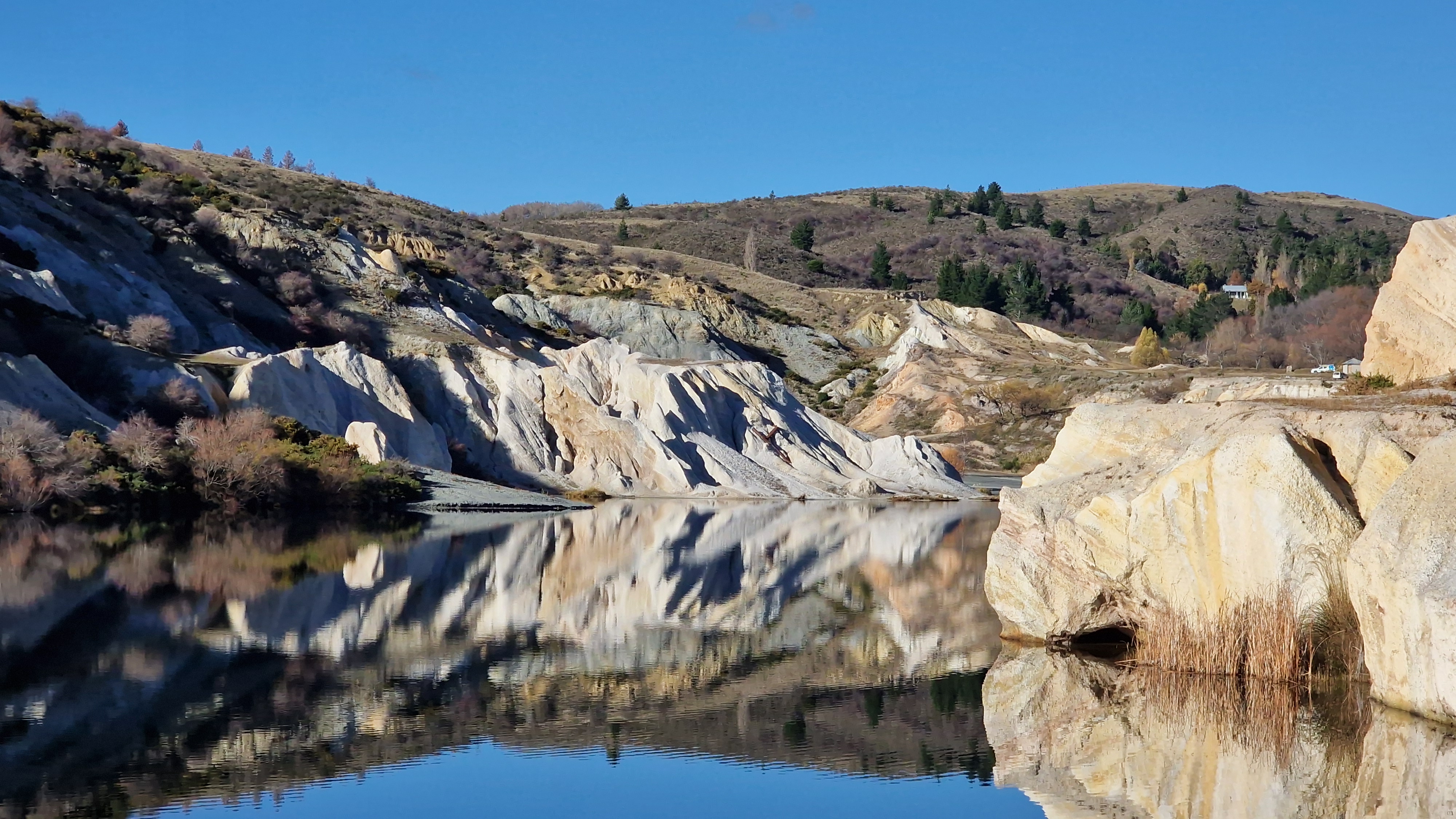 Cambrians & St. Bathans – Cambrians was established in 1863 and like much of this part of New Zealand, it was mining that created the town – both gold and coal. Buildings were made of mud bricks and corrugated iron. It is amazing that any are still standing today but they are. Seeing how small and basic some of the dwellings were, it leaves you pondering how hard life must have been for the miners and their families, especially in the harsh winters. St. Bathans was also established in 1863 and like Cambrians, the town grew up around the gold mining industry of the time. The current population of this town is 6 but it was once as high as two thousand. Of the several hotels that once existed here, only the Vulcan Hotel remains and what a gorgeous building it is. It had a Post Office (which is still in use) a, bank, gold assay office, constable’s cottage, magistrates court and gaol. Most of these are still standing and in use, including the church, one of the first prefabricated buildings in NZ. It is a shame that the only thing left of the courthouse is the very sturdy fireplace and chimneybreast. St. Bathans is also famous for the Blue Lake. It was created by the gold mining company who used water cannons to demolish Kildare Hill and then with excavators, sucked out a huge pit uncovering huge riches.