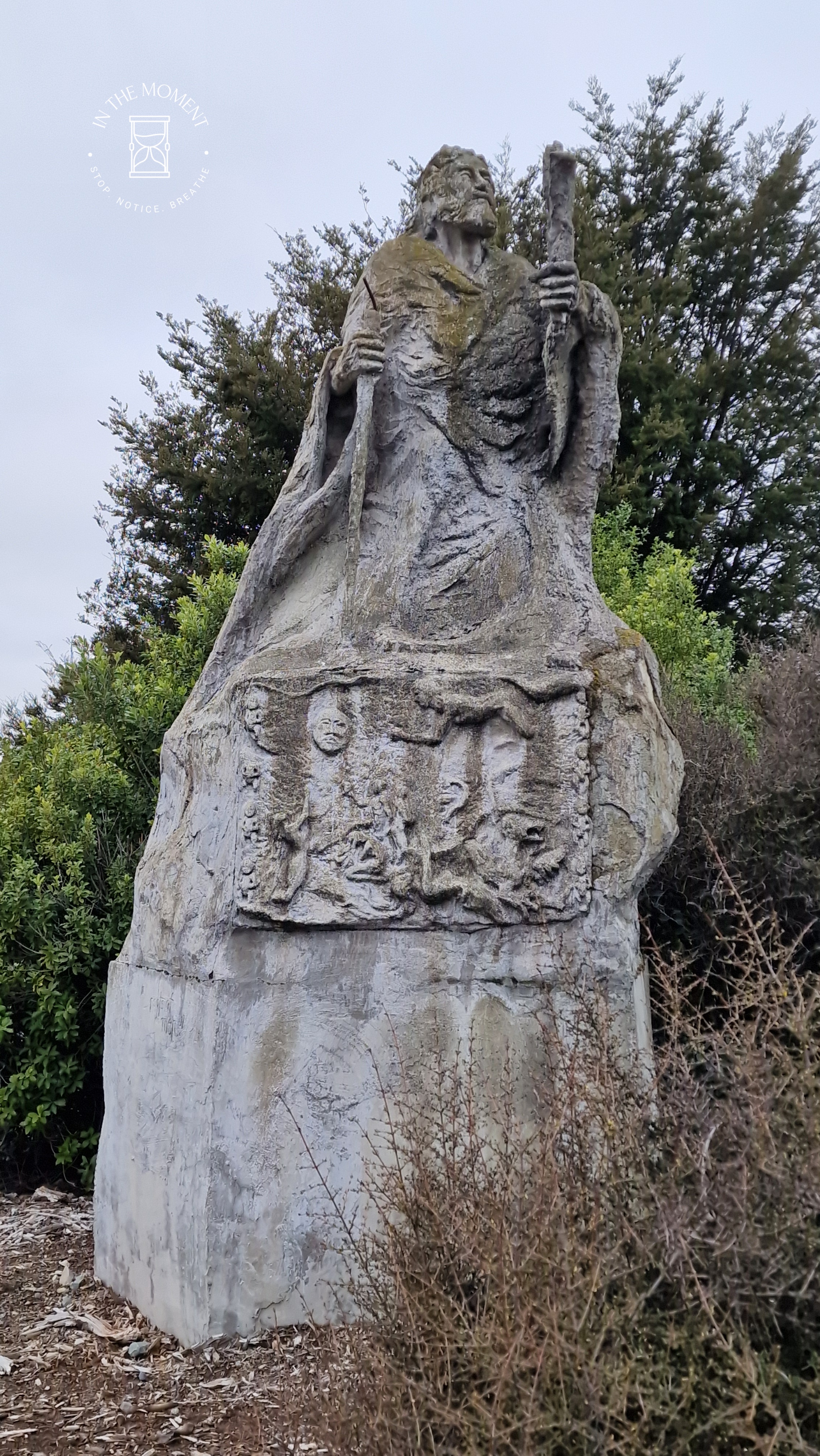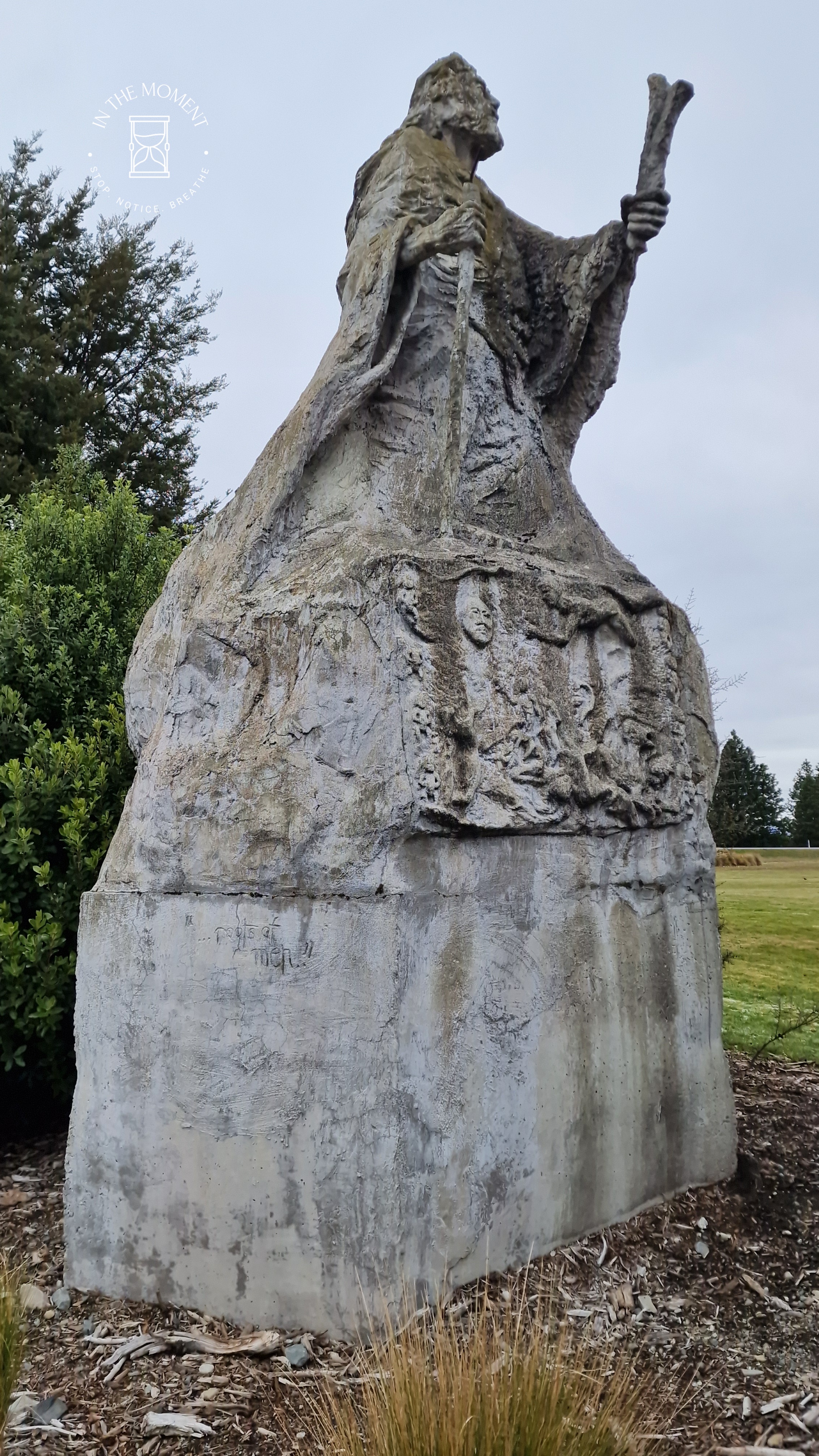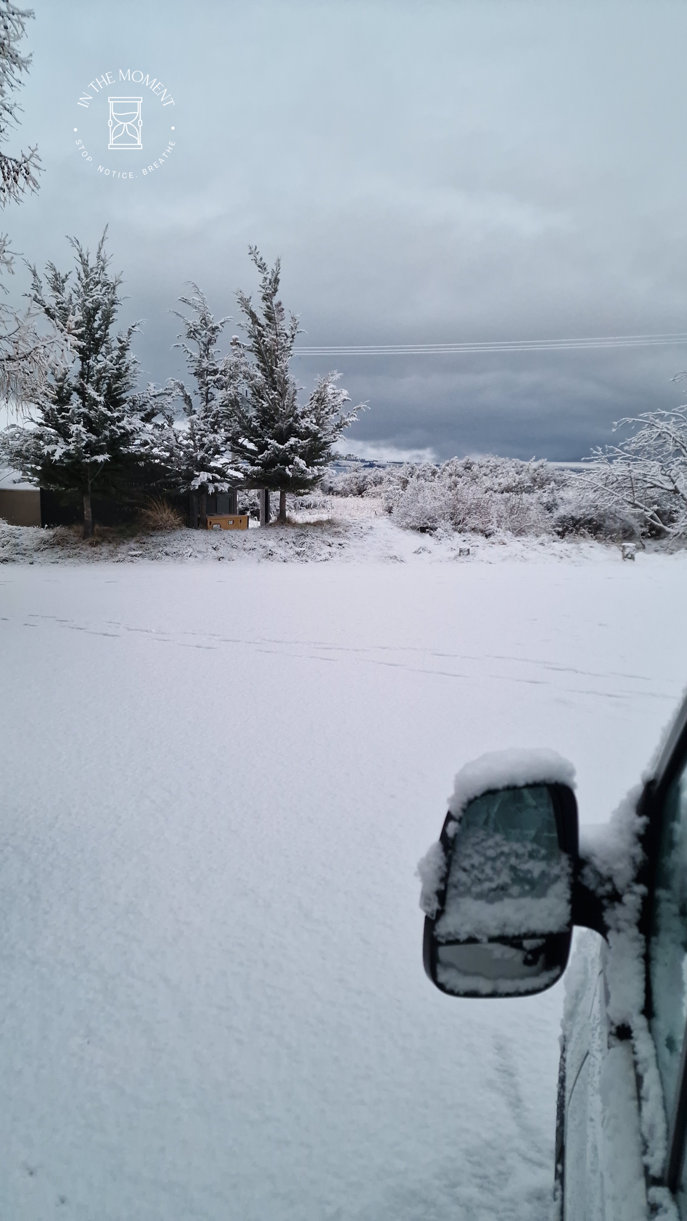 We had a quick stop in Twizel for coffee at The Musterers Hut Cafe and to top up on groceries. Saw some amazing Ministry of Works equipment and a rather unusual statue – nothing to explain what it was. Then off to Glentanner for a night where we woke up to fresh snowfall.