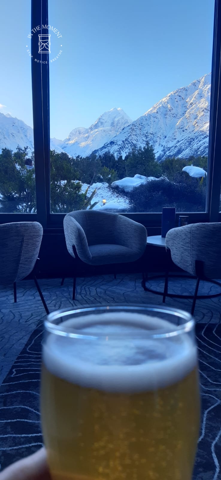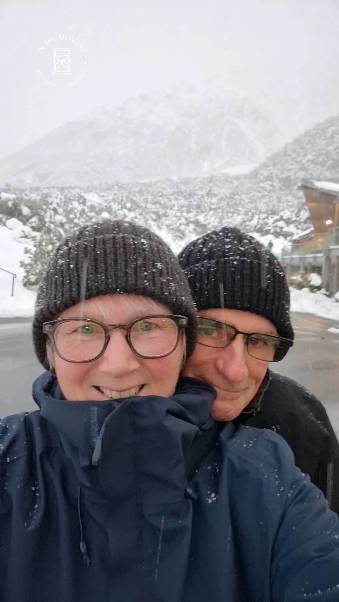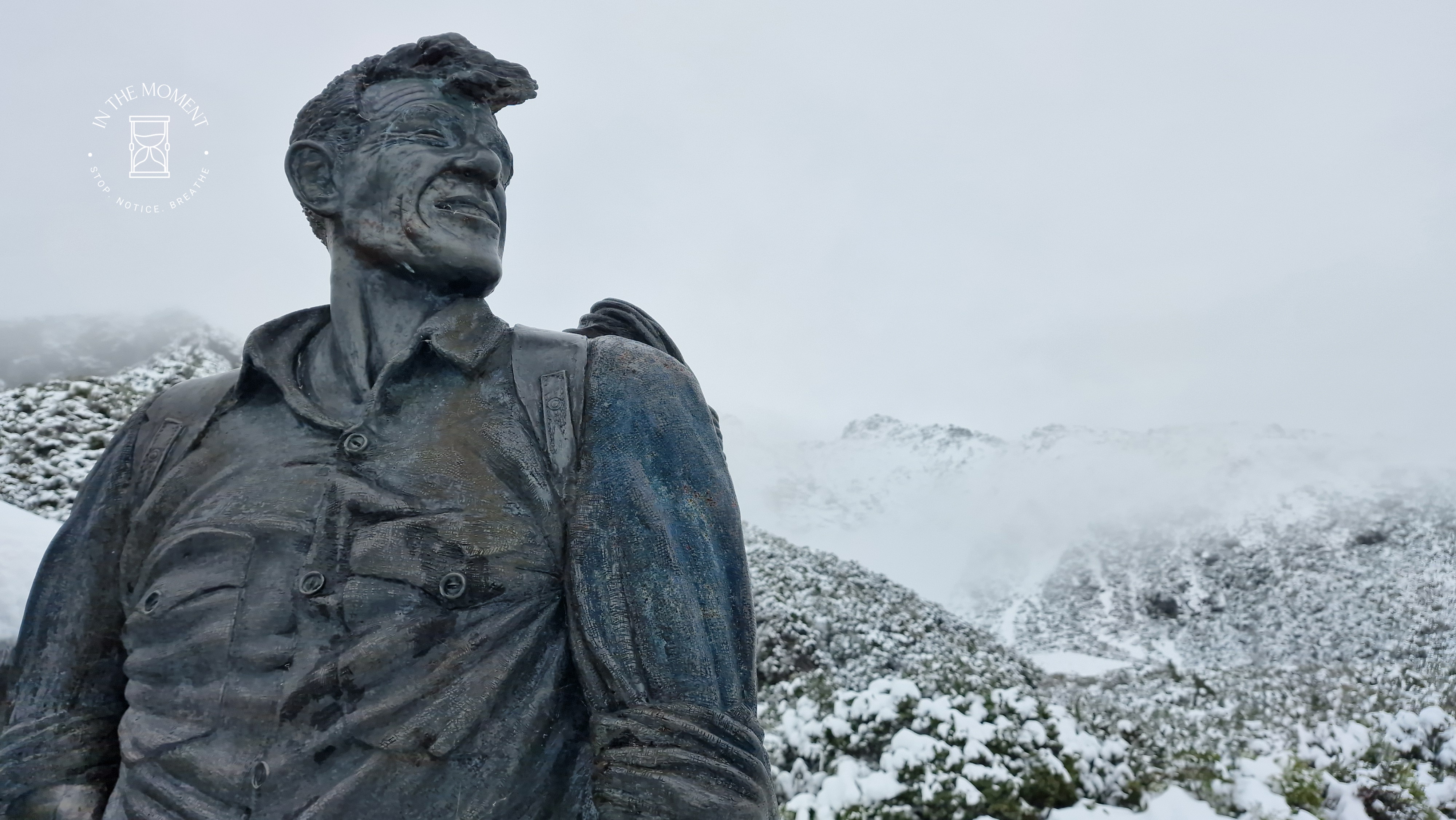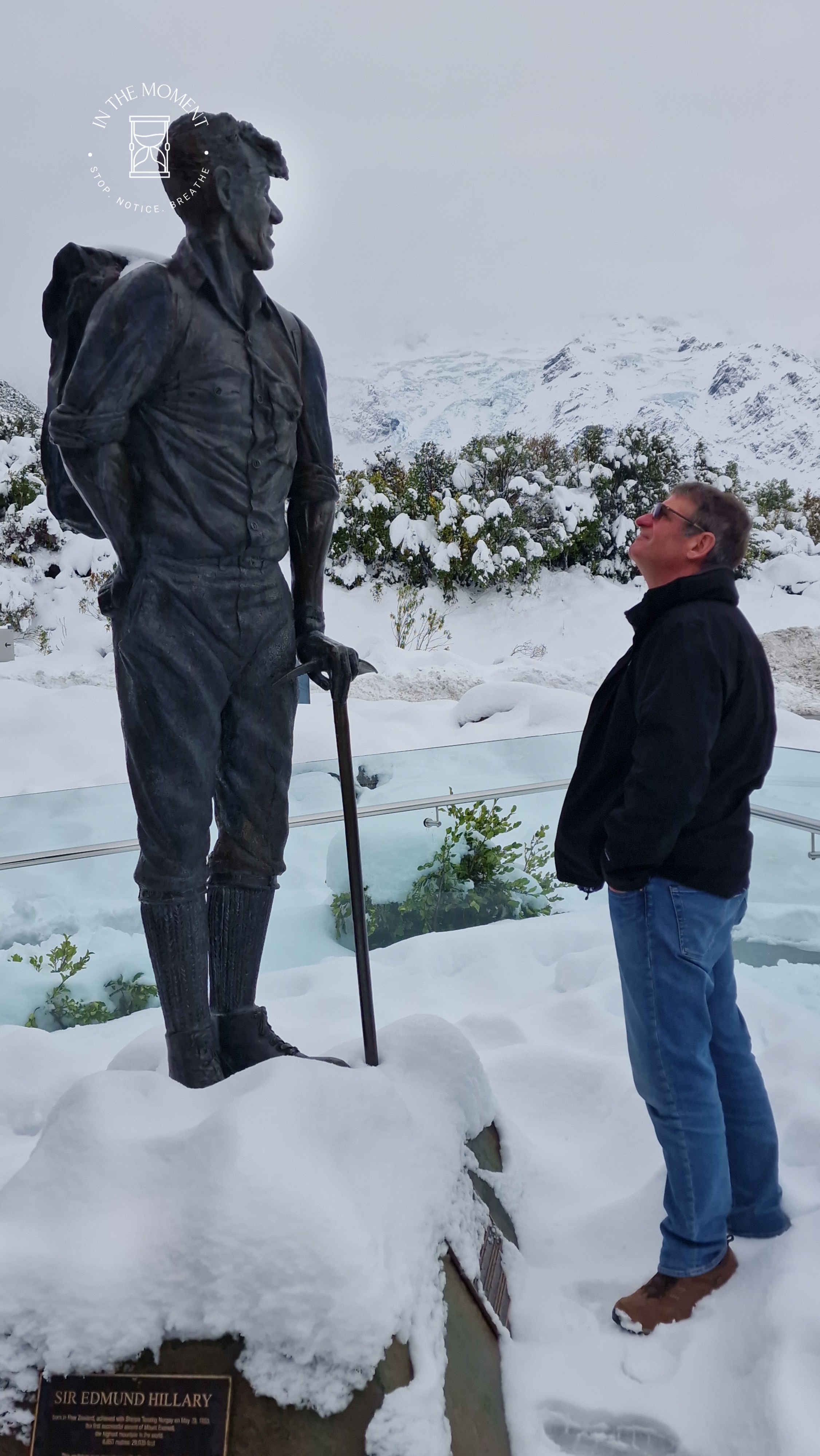What a glorious few days we’ve had in the National Park. I’d hoped for snow when we were planning our trip and oh boy did we get it! As we drove along SH80 from Glentanner to Aoraki, the landscape and thickness of snow changed quickly. I noticed Aoraki Mt. Cook School on the way in to the village and remarked to Don that I bet there was no closing for snow days like back at home! We had booked into the White Horse Hill DoC campsite for our time here and so when we arrived we checked in at the DoC Visitor Centre to see what the situation was with the campground. Unfortunately/fortunately due to the inclement weather conditions, they were planning to close the Hooker Valley road which goes to the camp until possibly Tuesday. As we’d booked, they said we could hunker down at the public shelter. And so we did. For three days, Aoraki stood shrouded in low cloud. For two of those days, we mostly hung out at The Hermitage in the Sir Edmund Hillary Cafe. Well, who doesn’t like a venison pie and a coffee while waiting for cloud to lift! There is a magnificent statue to Sir Edmund on the balcony of the cafe of him gazing out at Aoraki Mt. Cook.