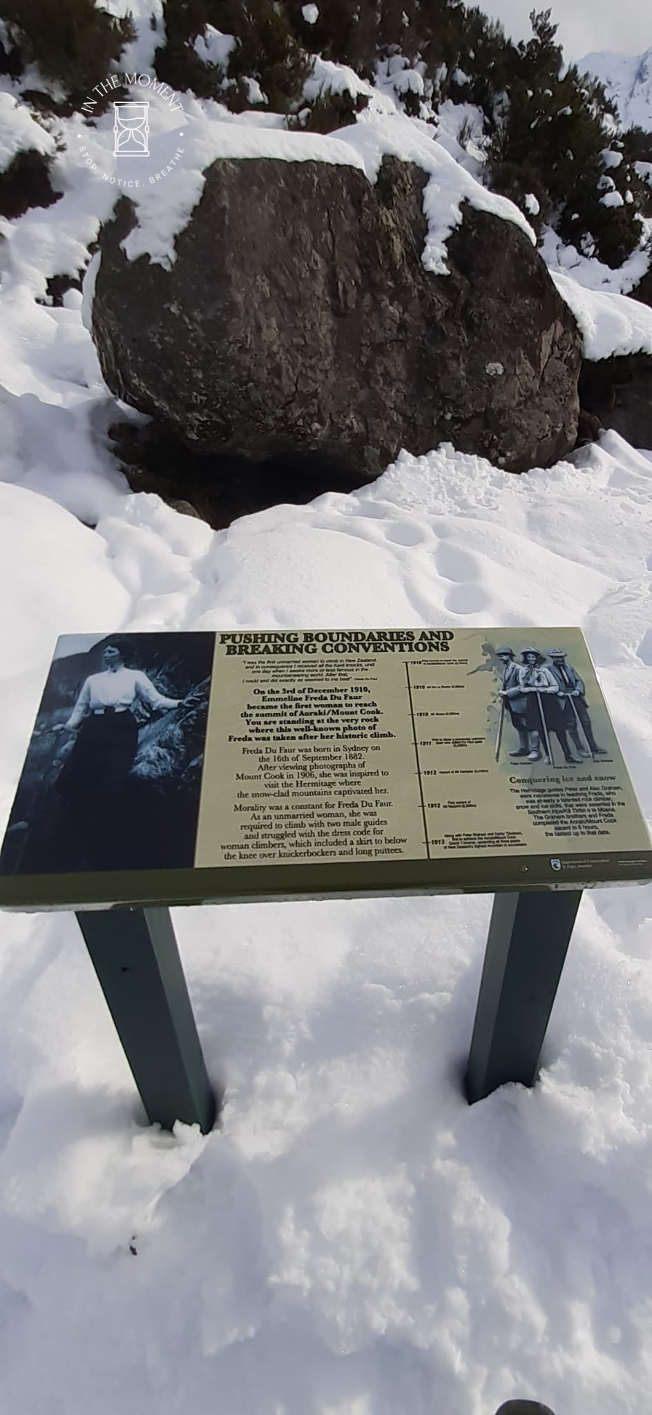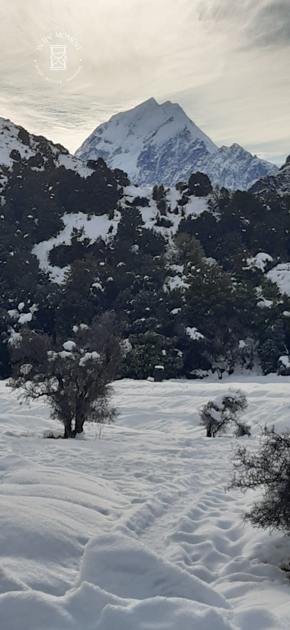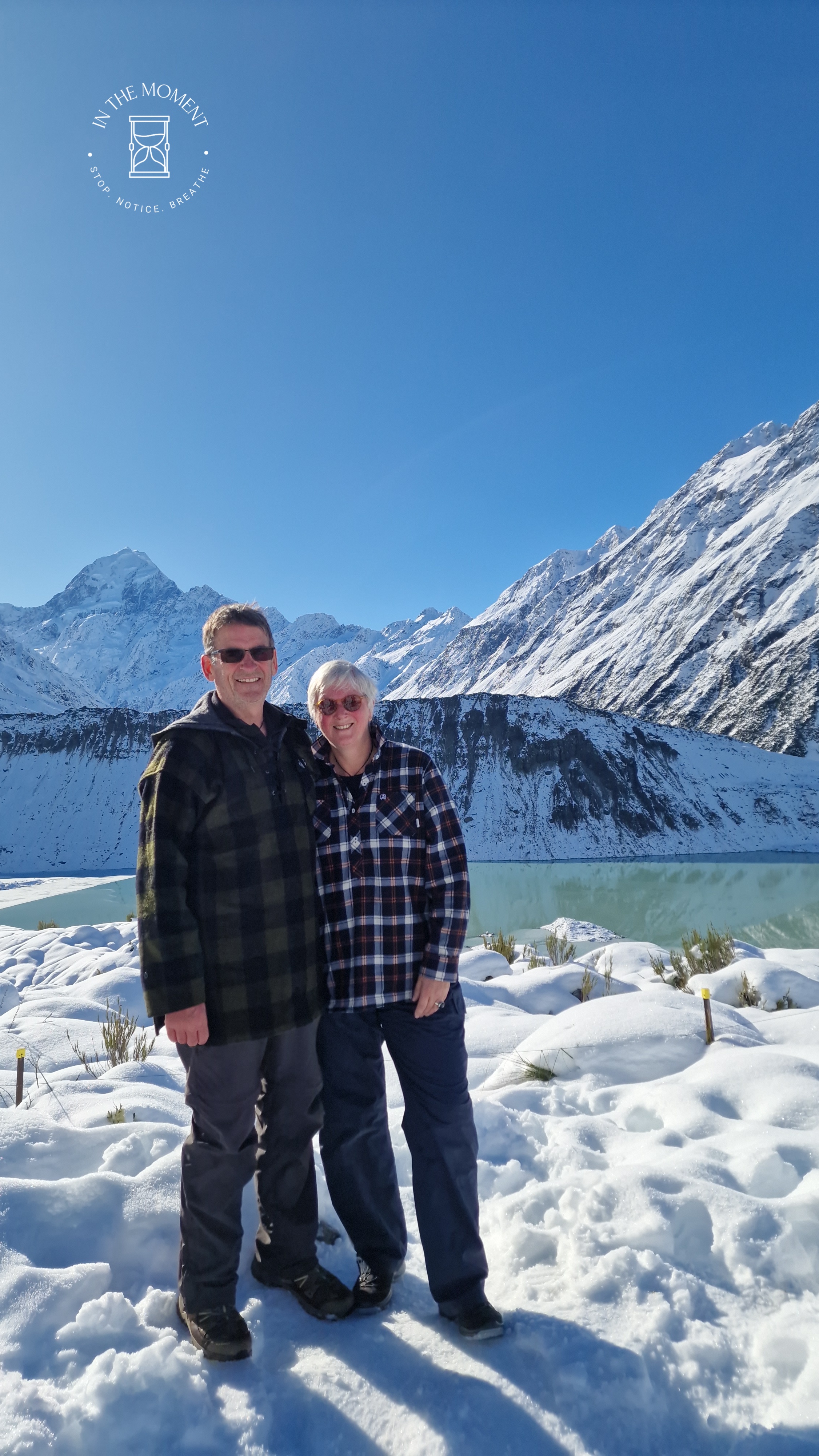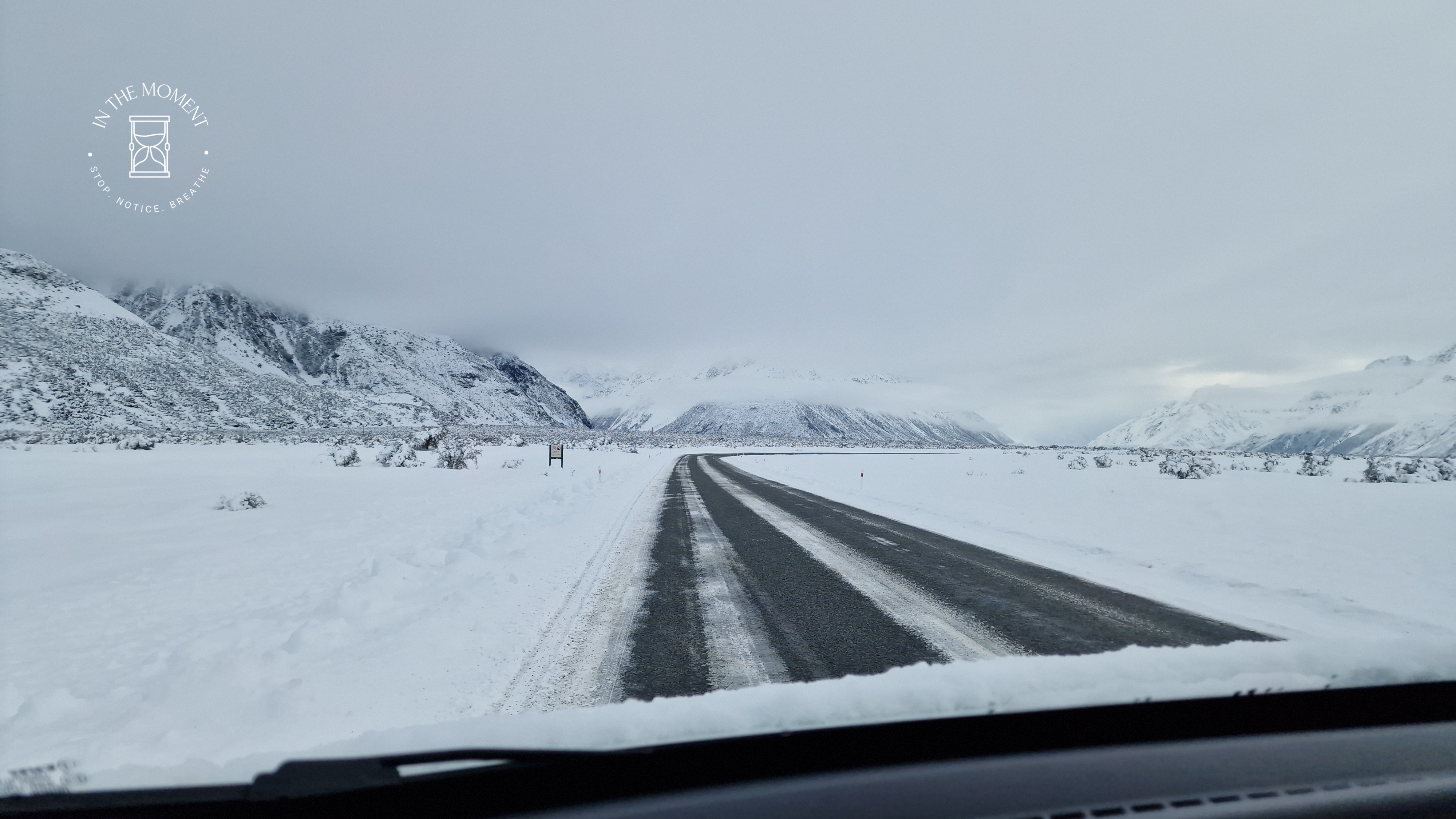 What a glorious few days we’ve had in the National Park. I’d hoped for snow when we were planning our trip and oh boy did we get it! As we drove along SH80 from Glentanner to Aoraki, the landscape and thickness of snow changed quickly. I noticed Aoraki Mt. Cook School on the way in to the village and remarked to Don that I bet there was no closing for snow days like back at home! We had booked into the White Horse Hill DoC campsite for our time here and so when we arrived we checked in at the DoC Visitor Centre to see what the situation was with the campground. Unfortunately/fortunately due to the inclement weather conditions, they were planning to close the Hooker Valley road which goes to the camp until possibly Tuesday. As we’d booked, they said we could hunker down at the public shelter. And so we did. For three days, Aoraki stood shrouded in low cloud. For two of those days, we mostly hung out at The Hermitage in the Sir Edmund Hillary Cafe. Well, who doesn’t like a venison pie and a coffee while waiting for cloud to lift! There is a magnificent statue to Sir Edmund on the balcony of the cafe of him gazing out at Aoraki Mt. Cook.