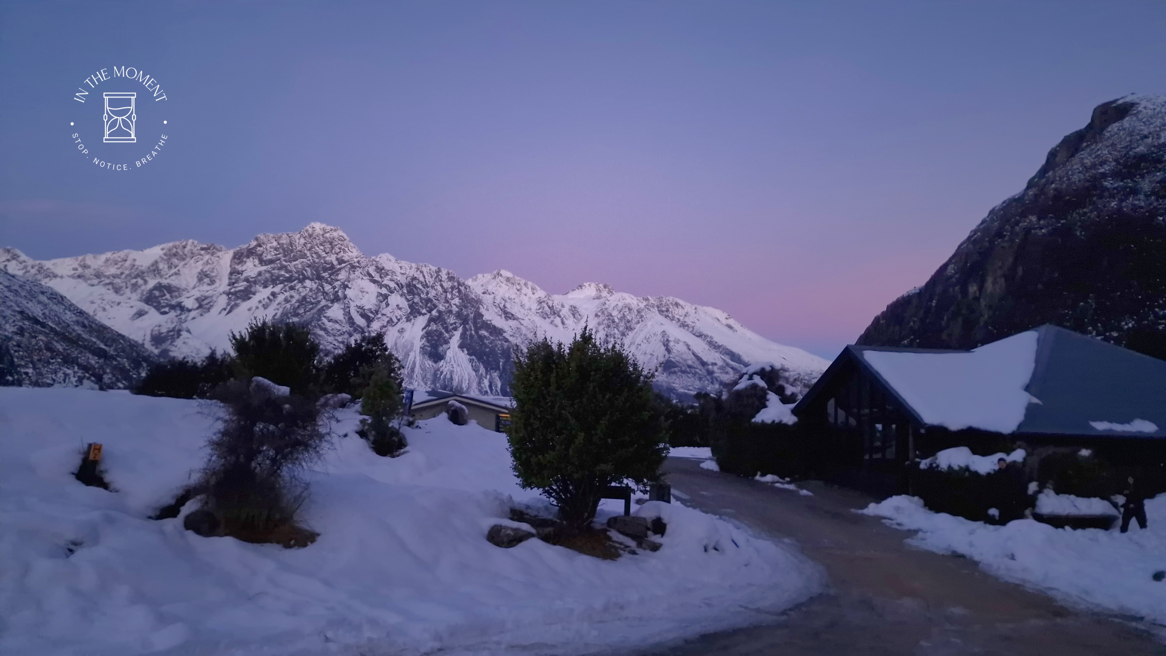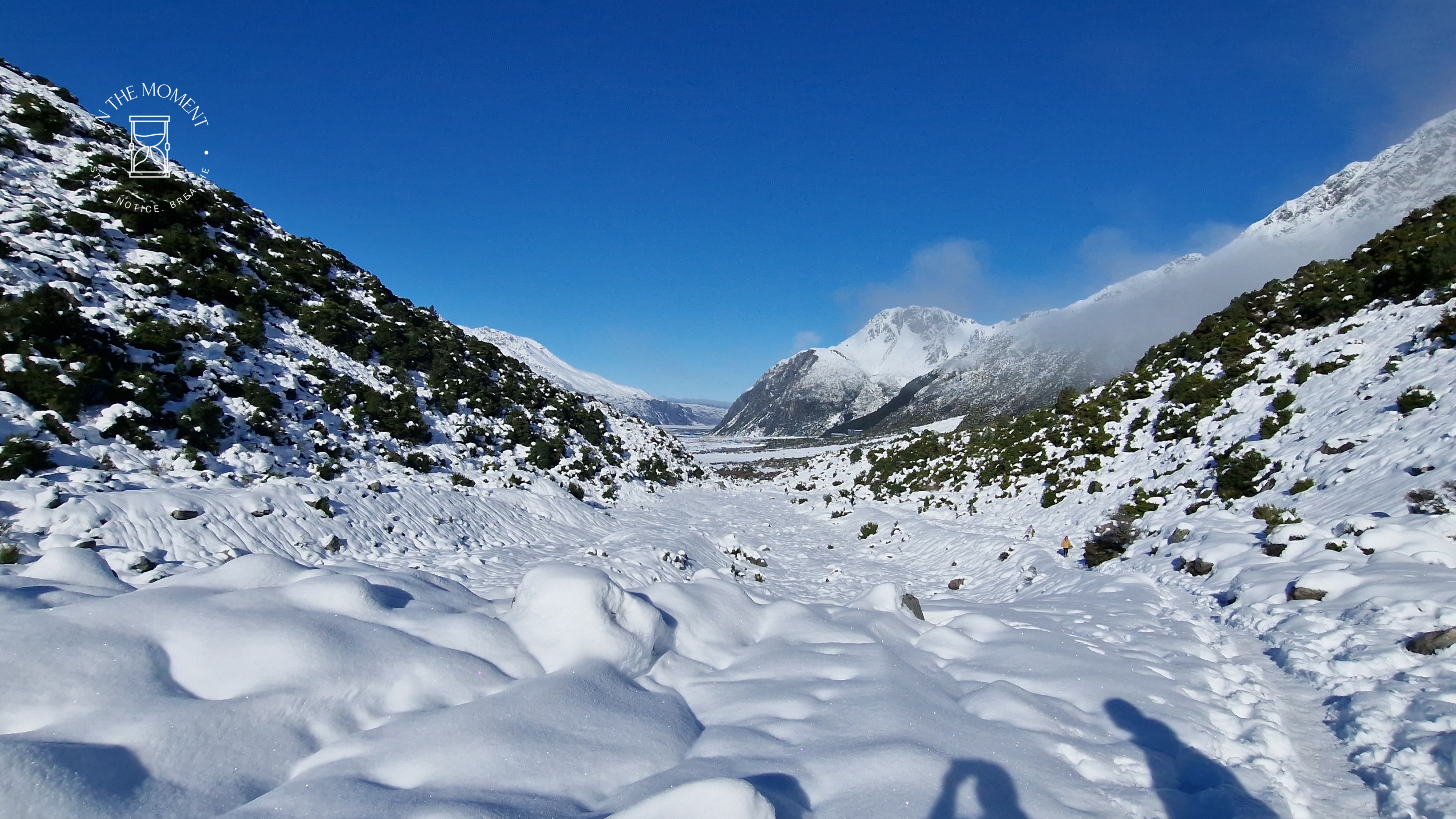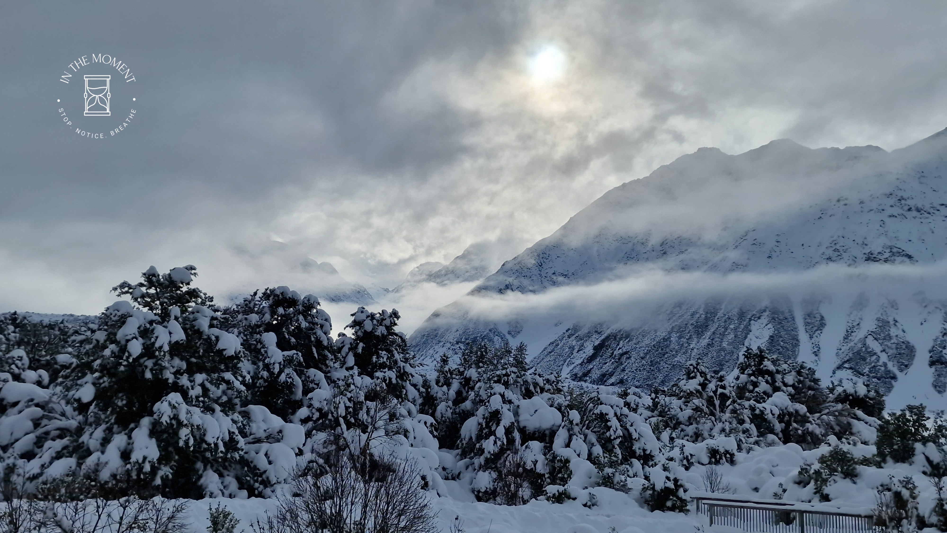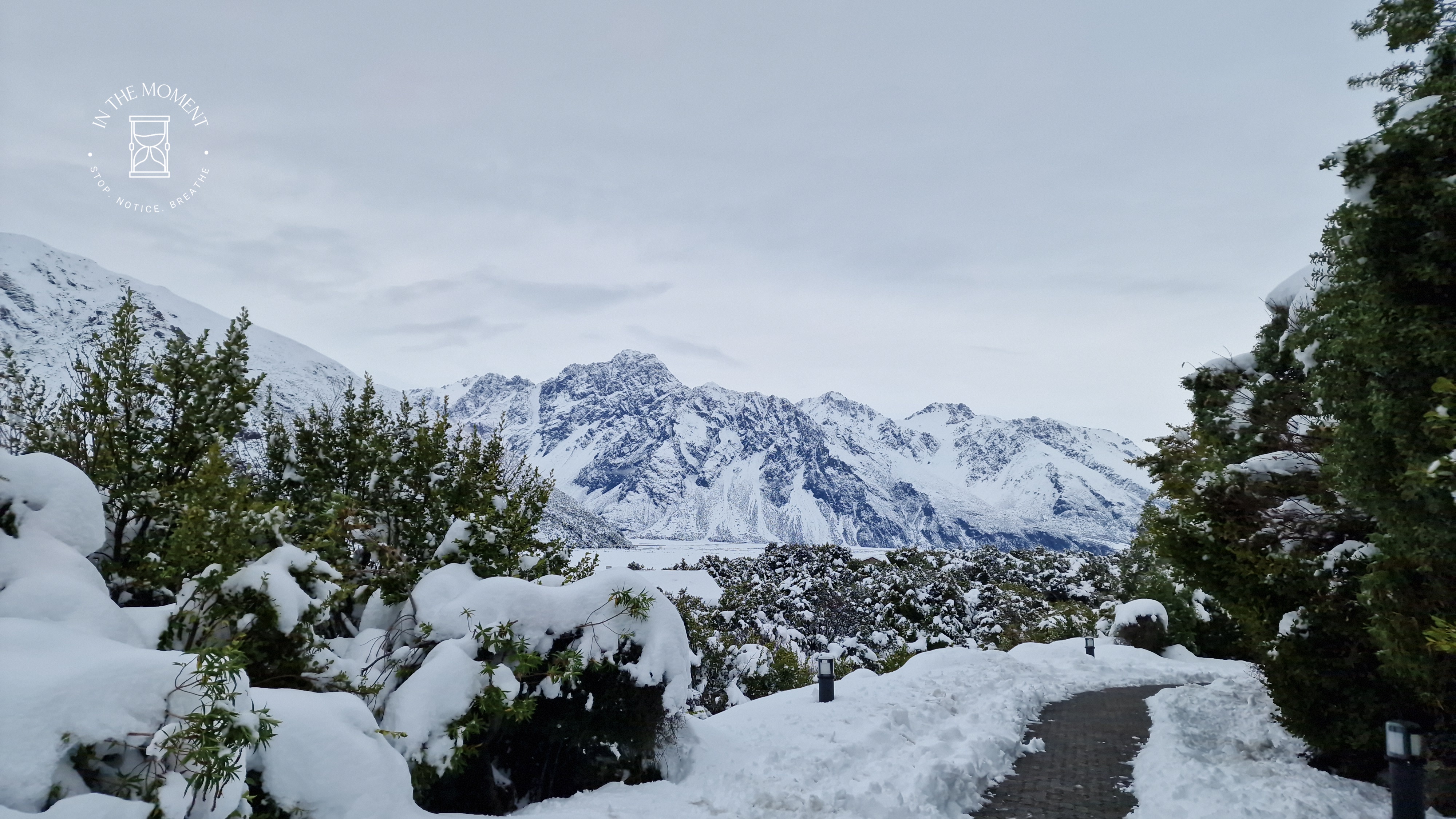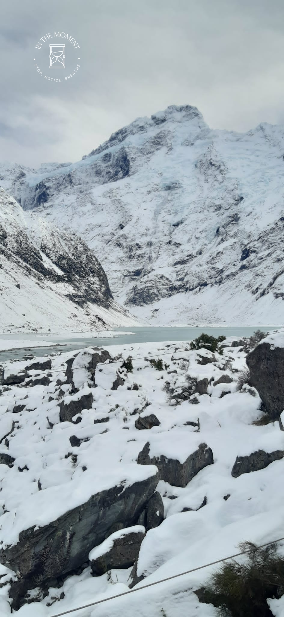 What a glorious few days we’ve had in the National Park. I’d hoped for snow when we were planning our trip and oh boy did we get it! As we drove along SH80 from Glentanner to Aoraki, the landscape and thickness of snow changed quickly. I noticed Aoraki Mt. Cook School on the way in to the village and remarked to Don that I bet there was no closing for snow days like back at home! We had booked into the White Horse Hill DoC campsite for our time here and so when we arrived we checked in at the DoC Visitor Centre to see what the situation was with the campground. Unfortunately/fortunately due to the inclement weather conditions, they were planning to close the Hooker Valley road which goes to the camp until possibly Tuesday. As we’d booked, they said we could hunker down at the public shelter. And so we did. For three days, Aoraki stood shrouded in low cloud. For two of those days, we mostly hung out at The Hermitage in the Sir Edmund Hillary Cafe. Well, who doesn’t like a venison pie and a coffee while waiting for cloud to lift! There is a magnificent statue to Sir Edmund on the balcony of the cafe of him gazing out at Aoraki Mt. Cook.