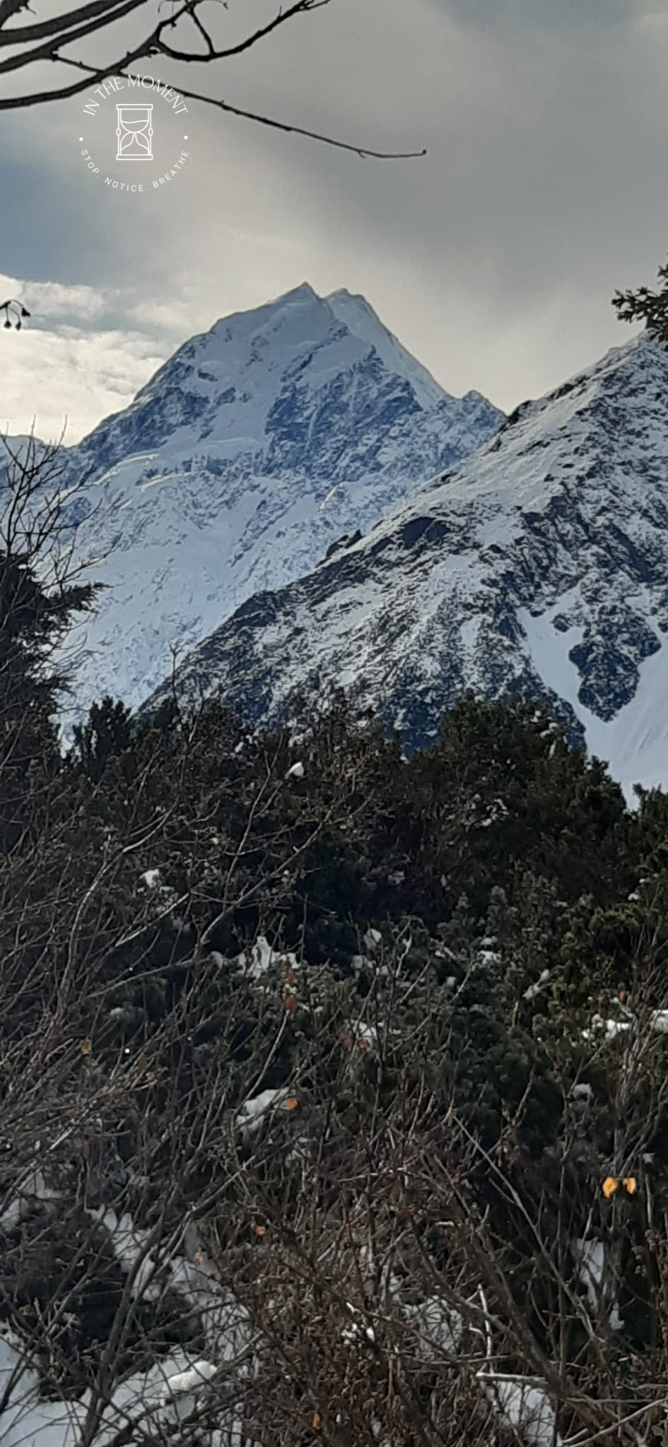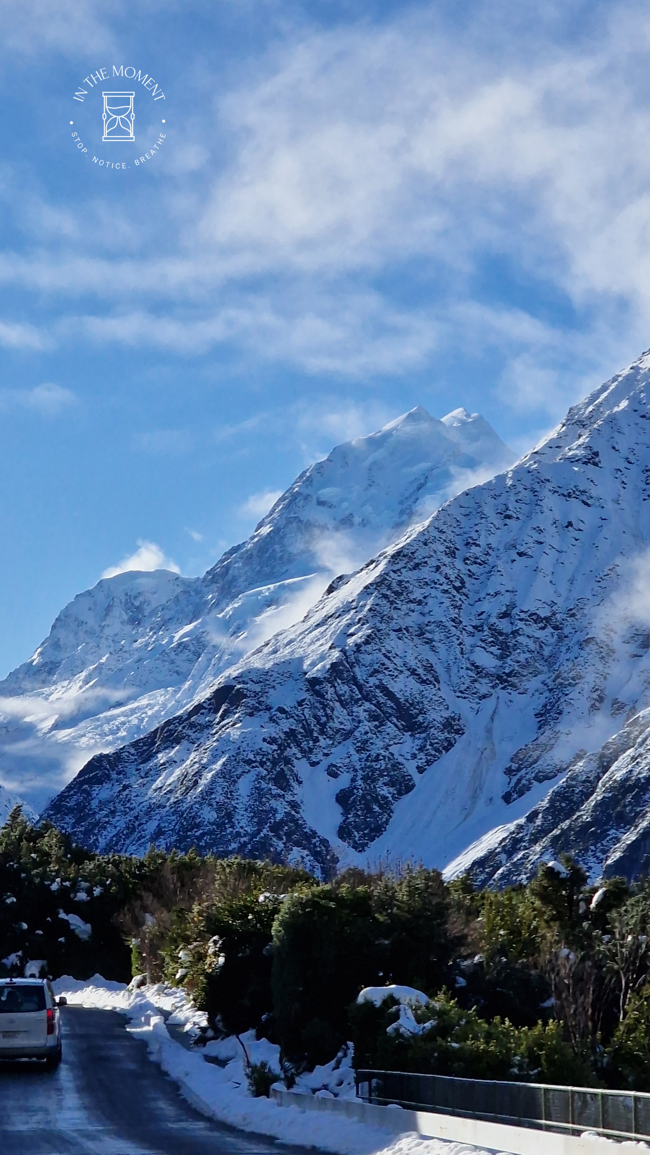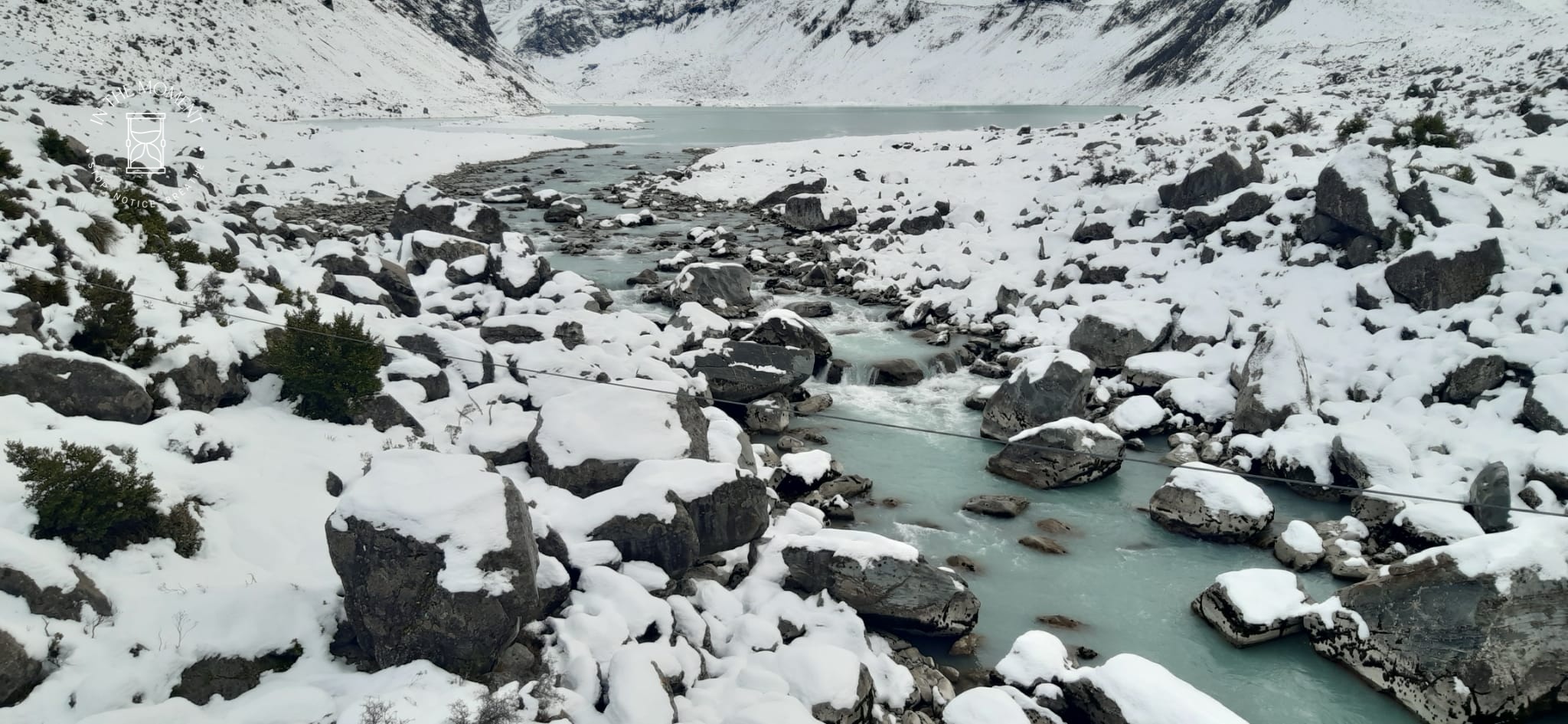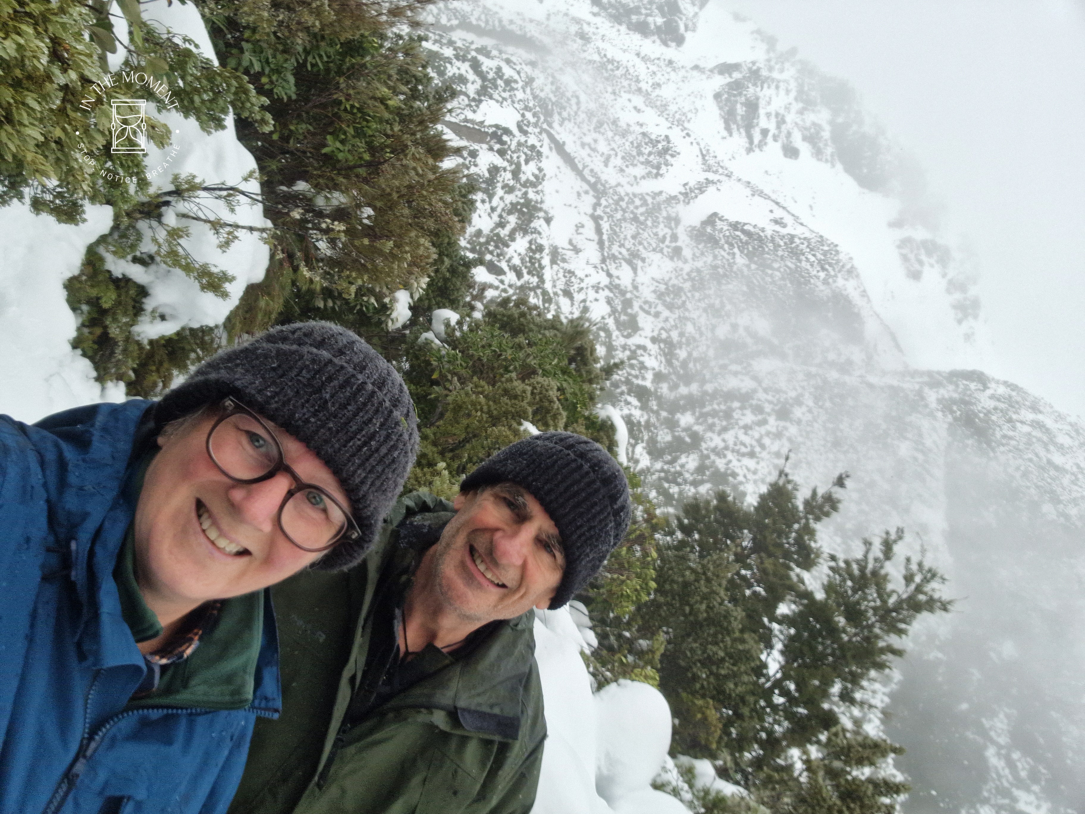 What a glorious few days we’ve had in the National Park. I’d hoped for snow when we were planning our trip and oh boy did we get it! As we drove along SH80 from Glentanner to Aoraki, the landscape and thickness of snow changed quickly. I noticed Aoraki Mt. Cook School on the way in to the village and remarked to Don that I bet there was no closing for snow days like back at home! We had booked into the White Horse Hill DoC campsite for our time here and so when we arrived we checked in at the DoC Visitor Centre to see what the situation was with the campground. Unfortunately/fortunately due to the inclement weather conditions, they were planning to close the Hooker Valley road which goes to the camp until possibly Tuesday. As we’d booked, they said we could hunker down at the public shelter. And so we did. For three days, Aoraki stood shrouded in low cloud. For two of those days, we mostly hung out at The Hermitage in the Sir Edmund Hillary Cafe. Well, who doesn’t like a venison pie and a coffee while waiting for cloud to lift! There is a magnificent statue to Sir Edmund on the balcony of the cafe of him gazing out at Aoraki Mt. Cook.