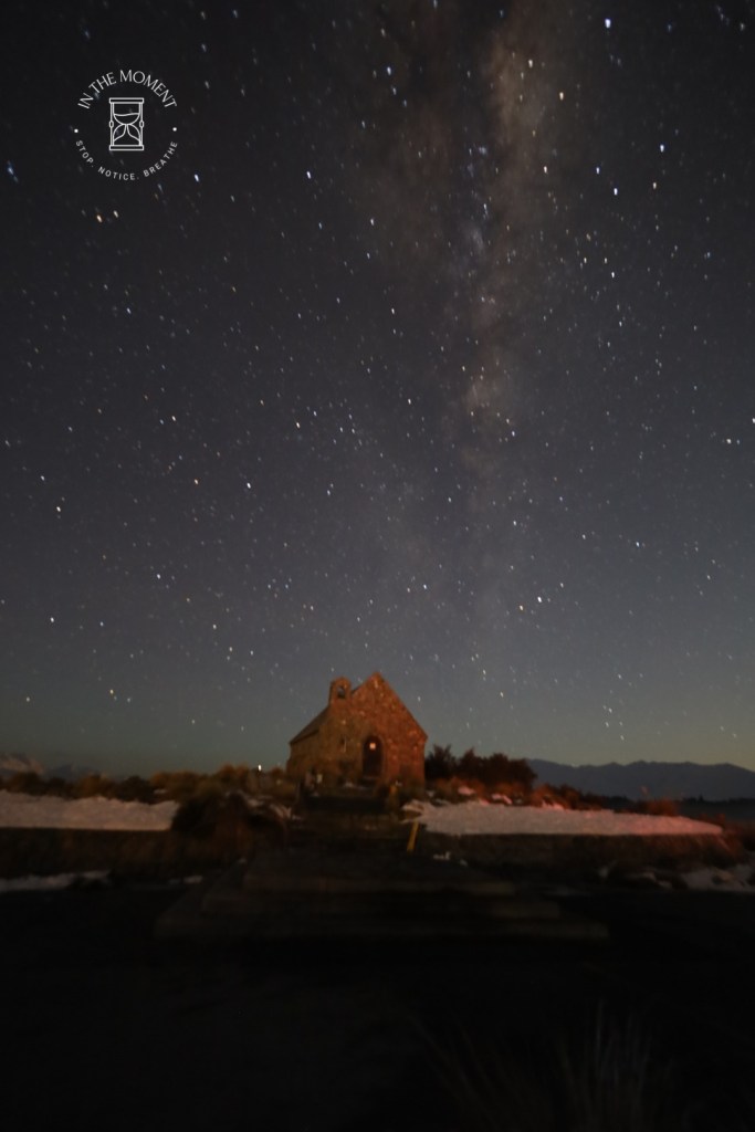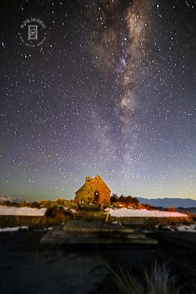 I have been trying to take photos of the night sky for a while now, initially with the camera on my mobile, through a pair of binoculars but more recently on my “proper” camera. As you can see in the photo on the left below, I have yet to find success. What I have been able to do, is have some really great help and advice from a New Zealand photographer who I discovered on Facebook – Kiwi Photographer. With his help & suggestions, I am trying to hone my skills! On the night I went up to the top of Mt. John, the sky was so clear and the Milky Way was just glorious. I set up my tripod and camera with the aim of taking a shot by the Church of the Good Shepherd. Now, just for information, I have long been against using software to tweek my photos. Yes I have used filters but nothing more than that. Kiwi Photographer has shown me just what a difference using editing software can make. So whilst I can take credit for the actual composition of this photo, I have to say a huge THANK YOU and give credit to Kiwi Photographer for the final image you see here.